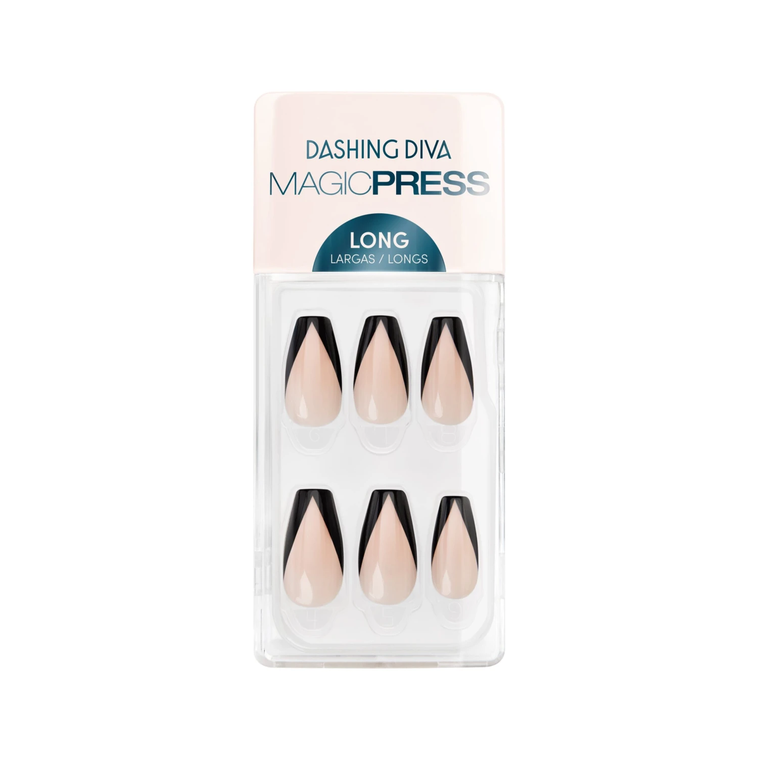 Take your traditional French manicure from cocktail hour to after hours.. Long length, coffin shape, glossy finish sheer nude press-on gel nails featuring black V-shaped French tip accents.
