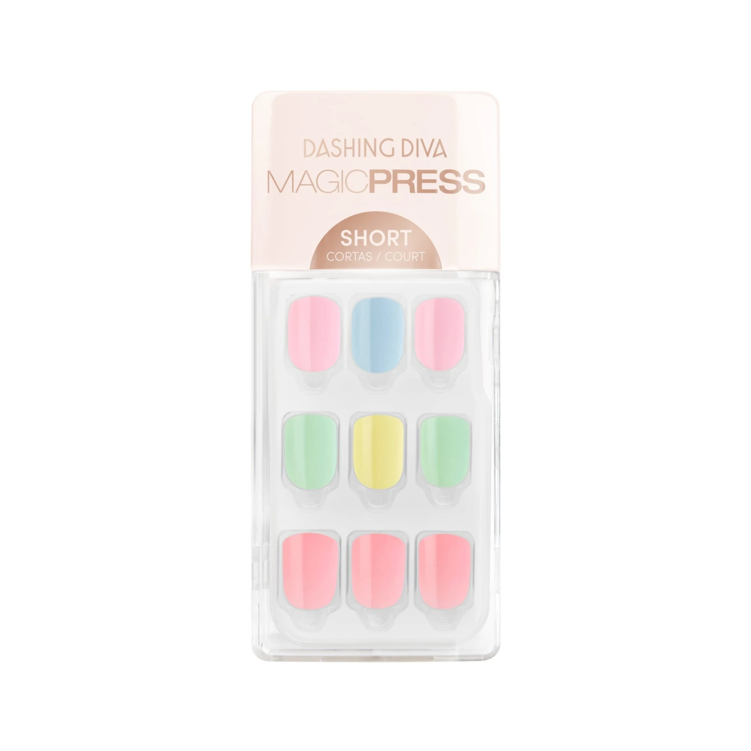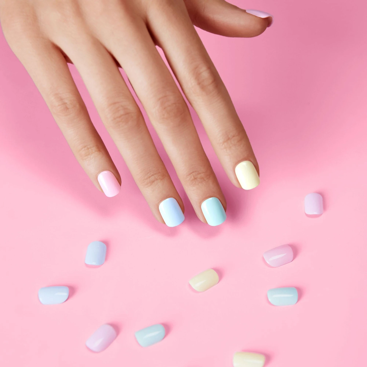 Short length, square shape, glossy finish press-on gel nails featuring multi bright pastel solid colors.