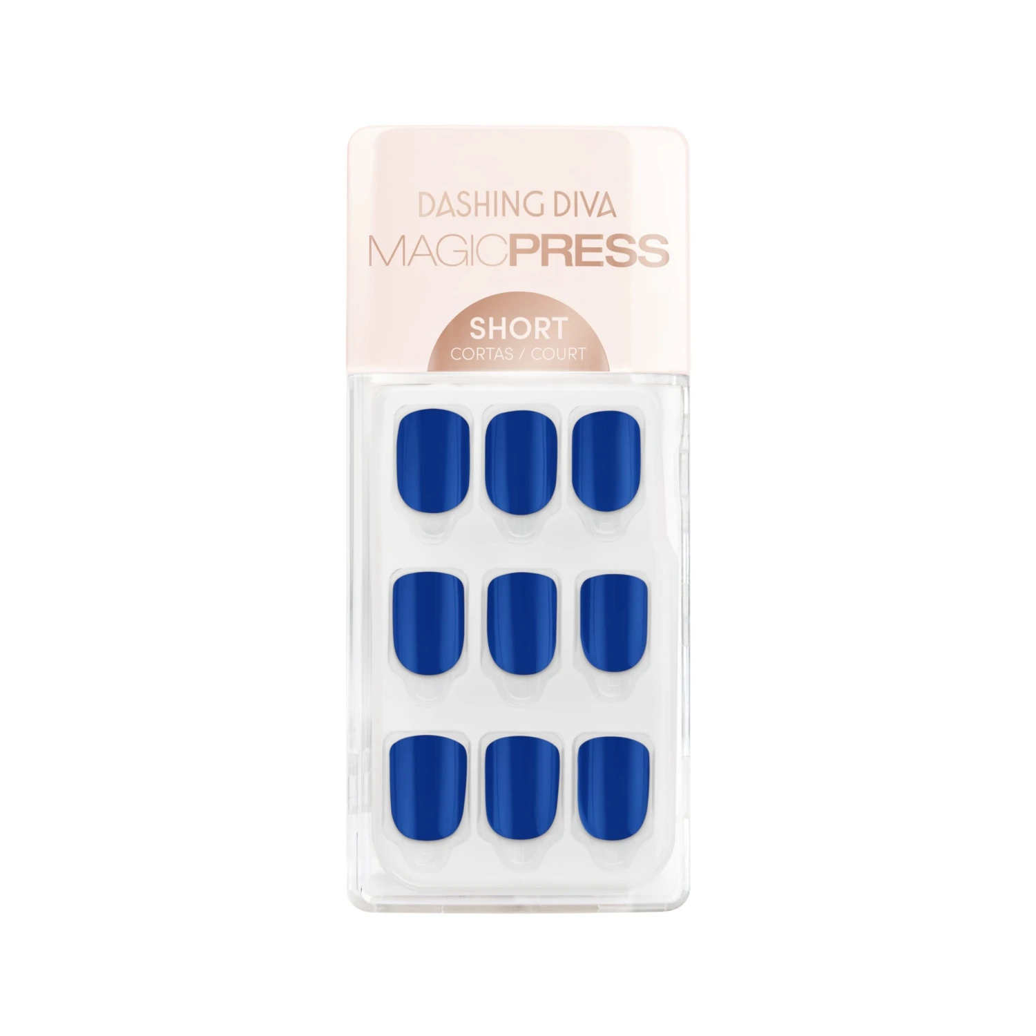 Short length, square shape, glossy finish press-on gel nails. Bright blue polish minus the paisley print.