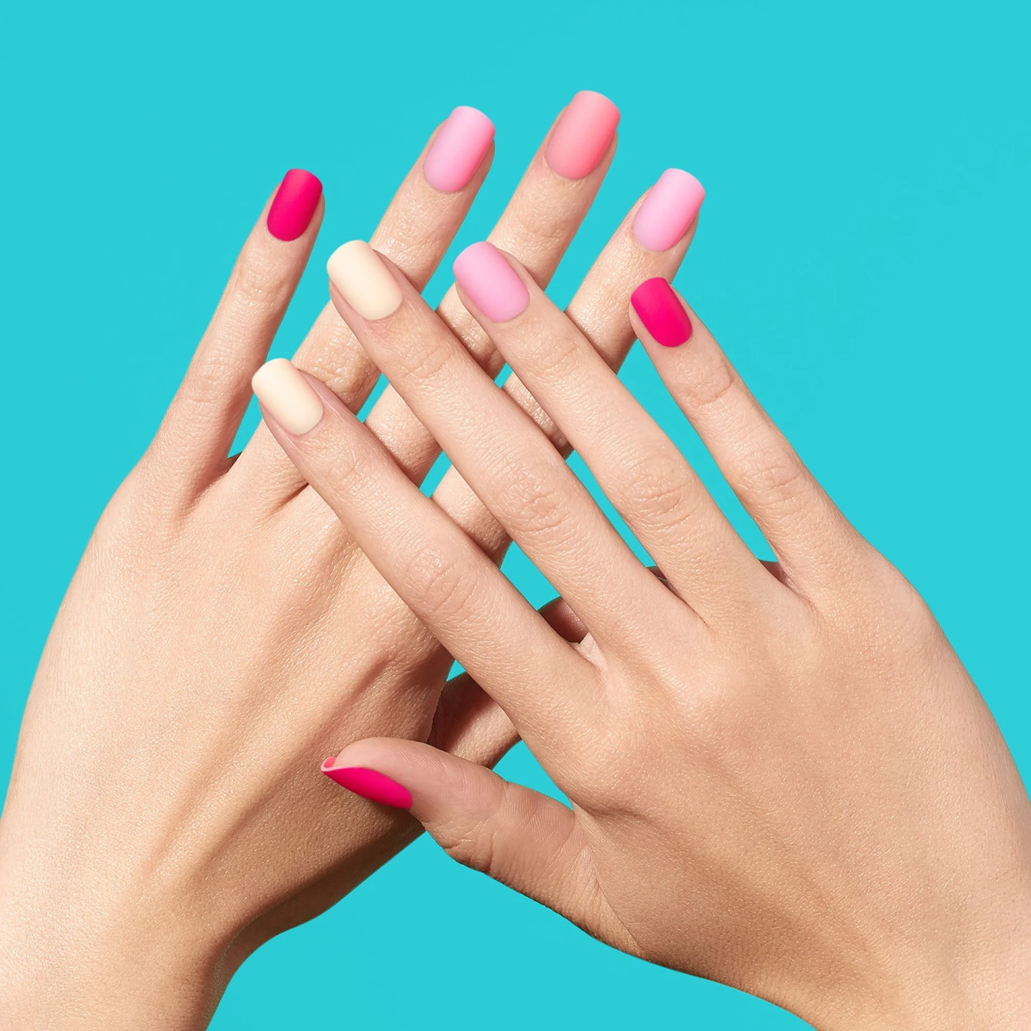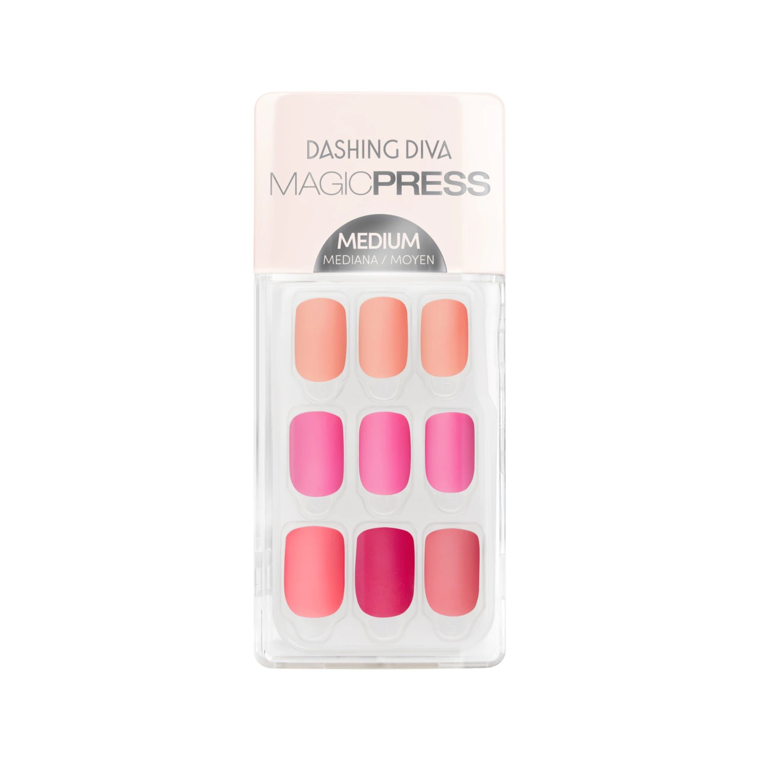 Dress your nails in the colors of Barbie’s wardrobe! Medium length, square shape, matte finish pink & peach press-on gel nails.