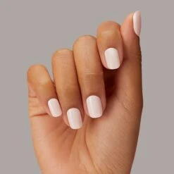 Short length, square shape, light nude-pink press-on gel nails featuring a glossy, shimmery chrome finish.