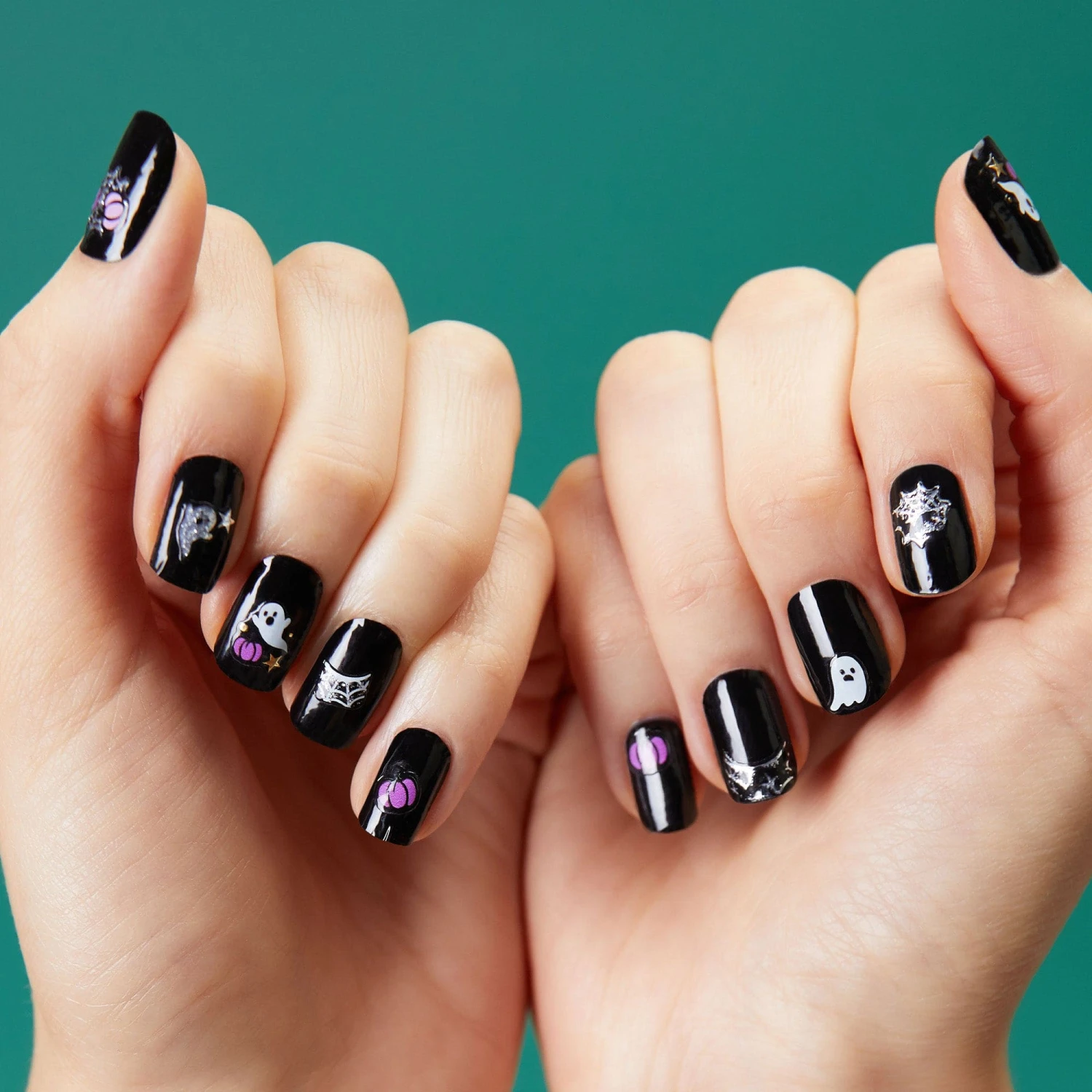 Turn yourself into a battie this Halloween! Premium nail art stickers featuring expressive designs, including bat & ghost iconography. Glow in the dark details.
