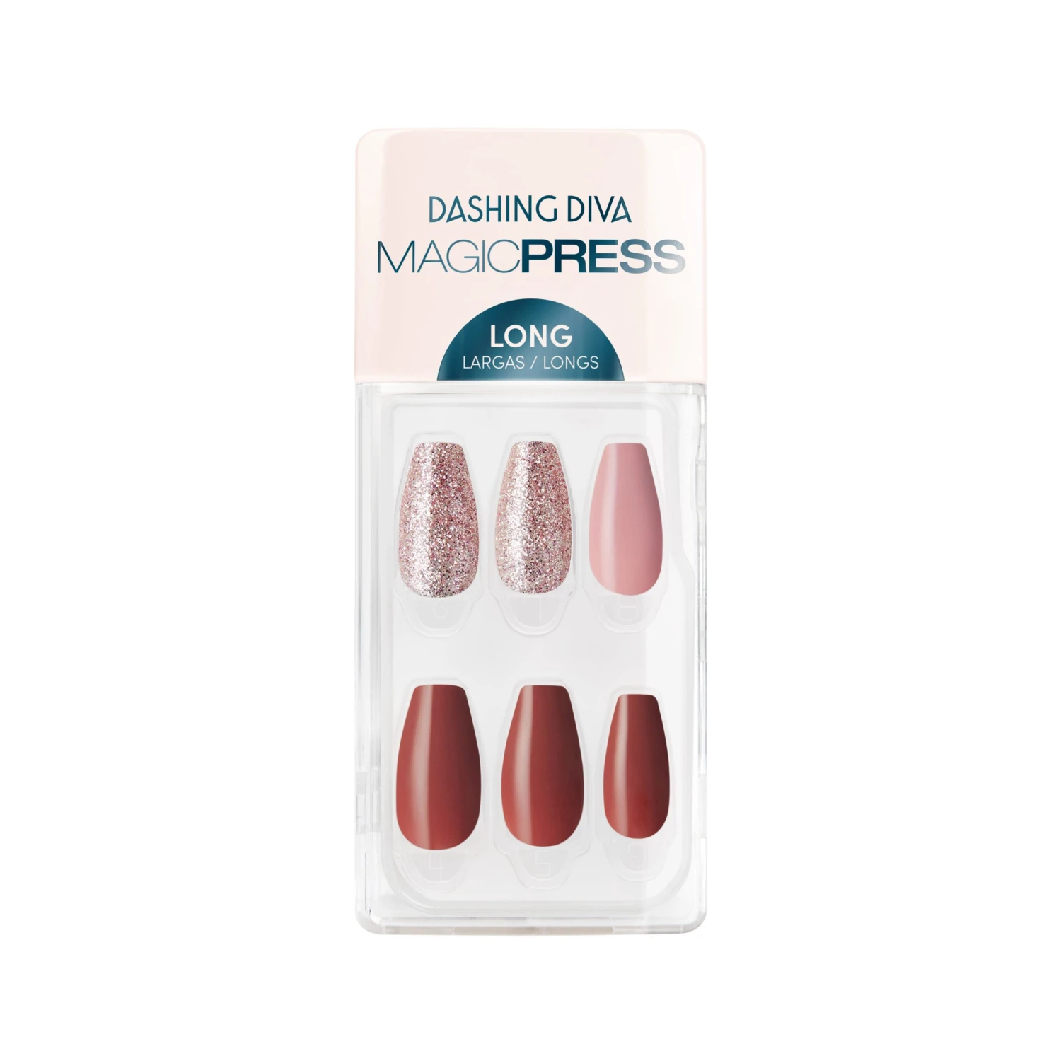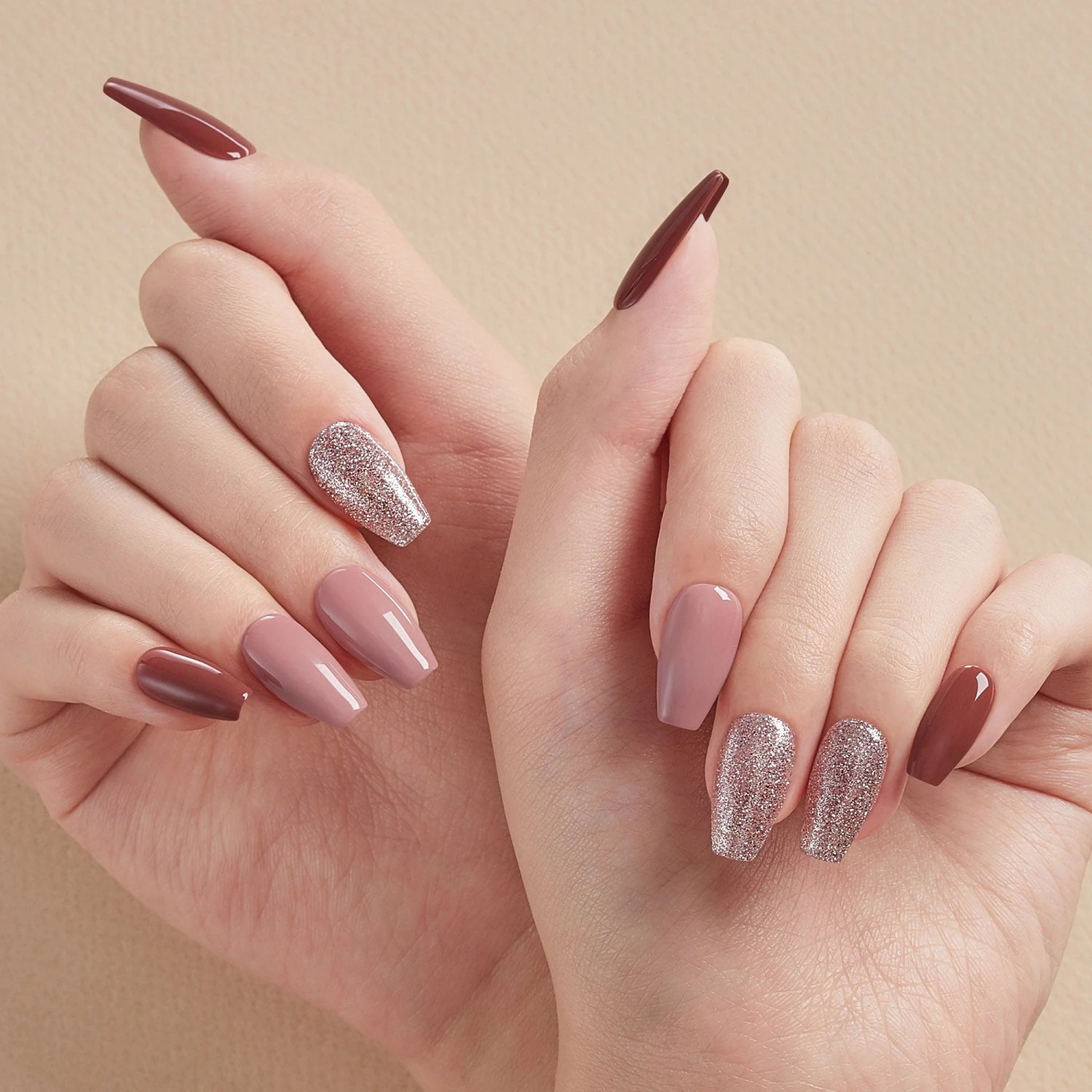 You can never go wrong with a blushing beauty! Medium length, coffin shape, glossy finish press-on gel nails featuring twinkling glitters, cozy oranges, and muted pinks.