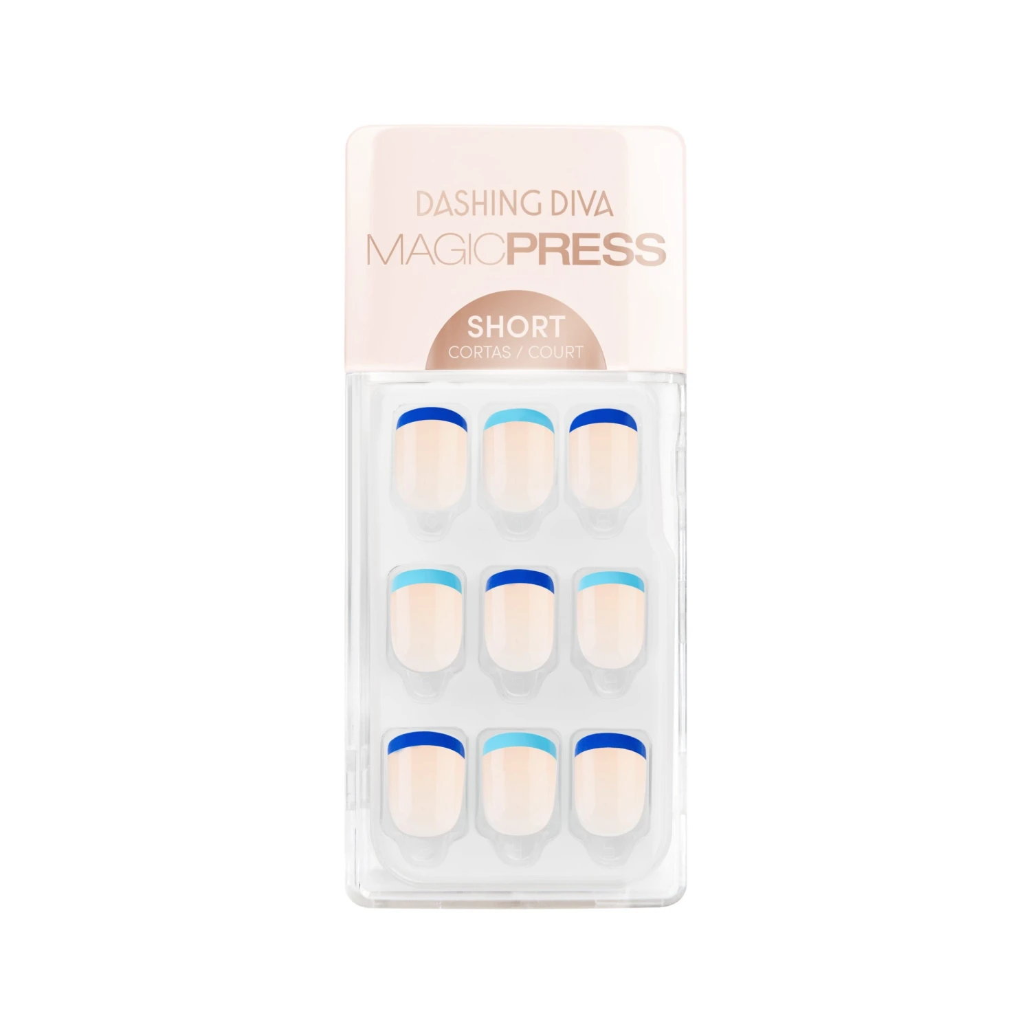 Better be Blue than boring with French tips that keep you on your toes! Short length, square shape, glossy finish light nude press-on gel nails featuring light blue & royal blue French tips.
