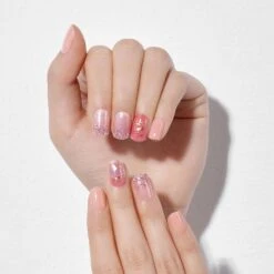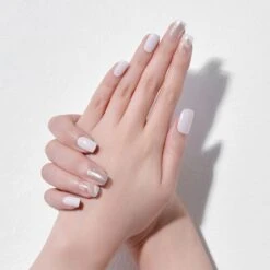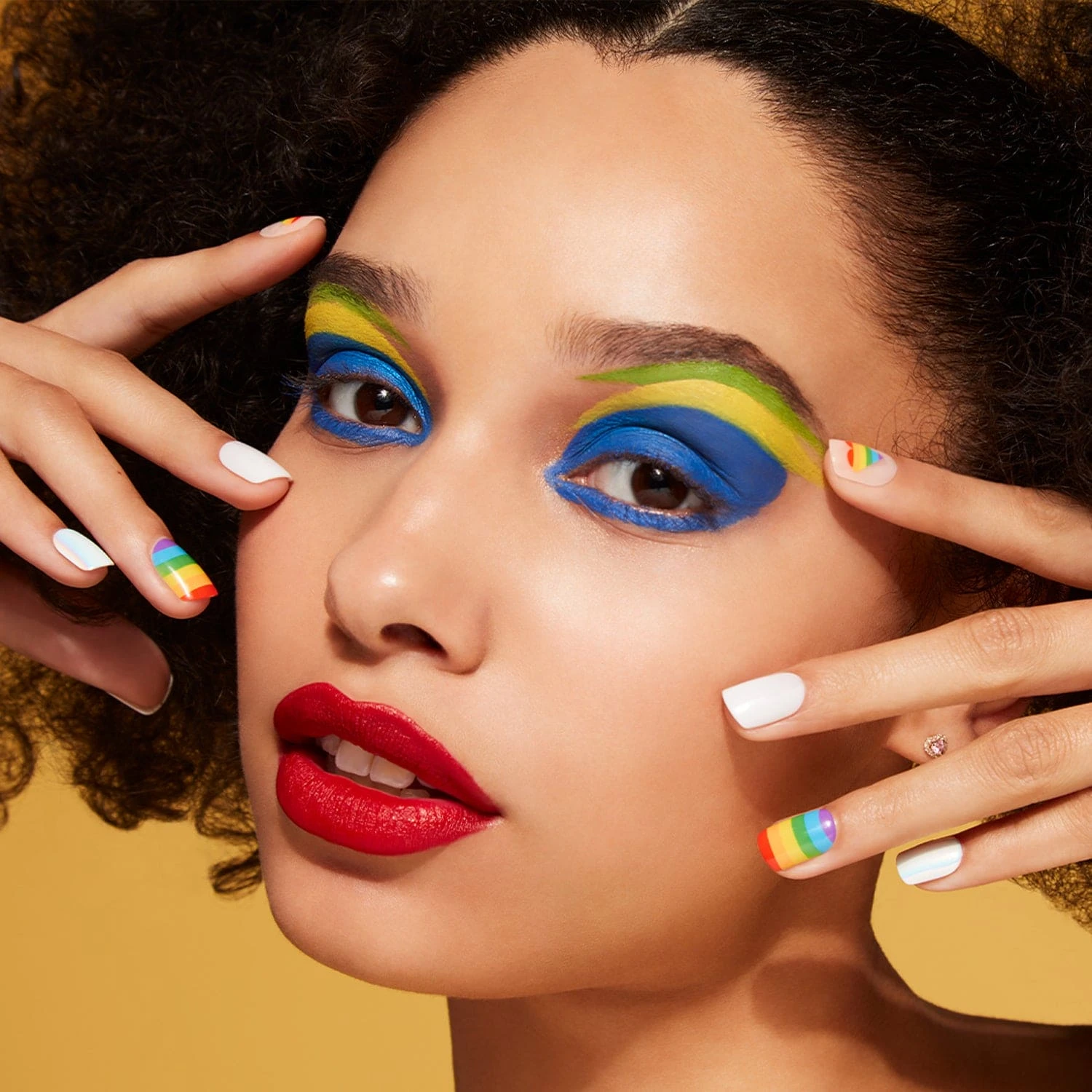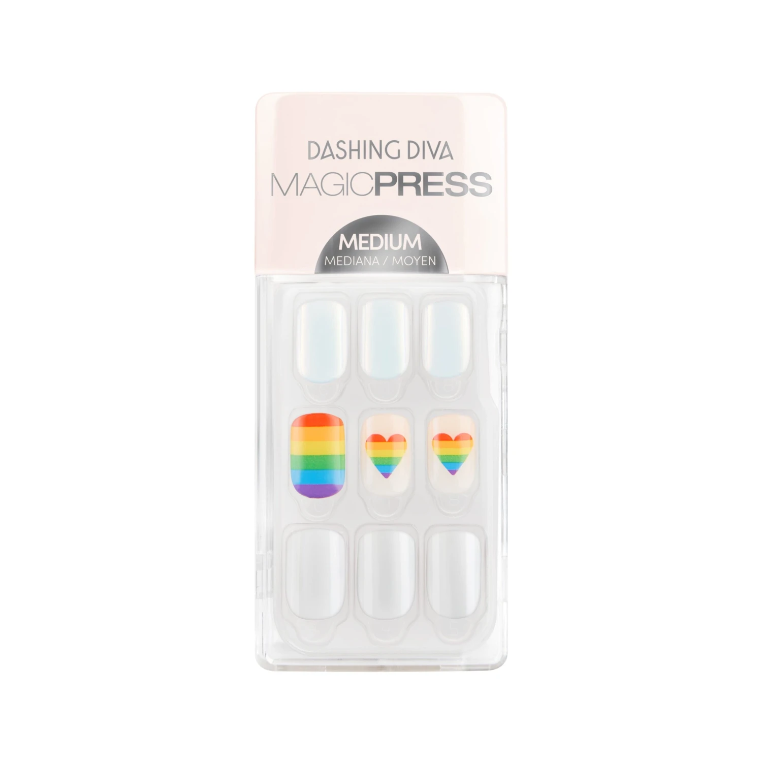 Rainbows and hearts are simply Better Together. Medium length, square shape, glossy finish white press-on gel nails featuring rainbow stripes & rainbow heart icons.