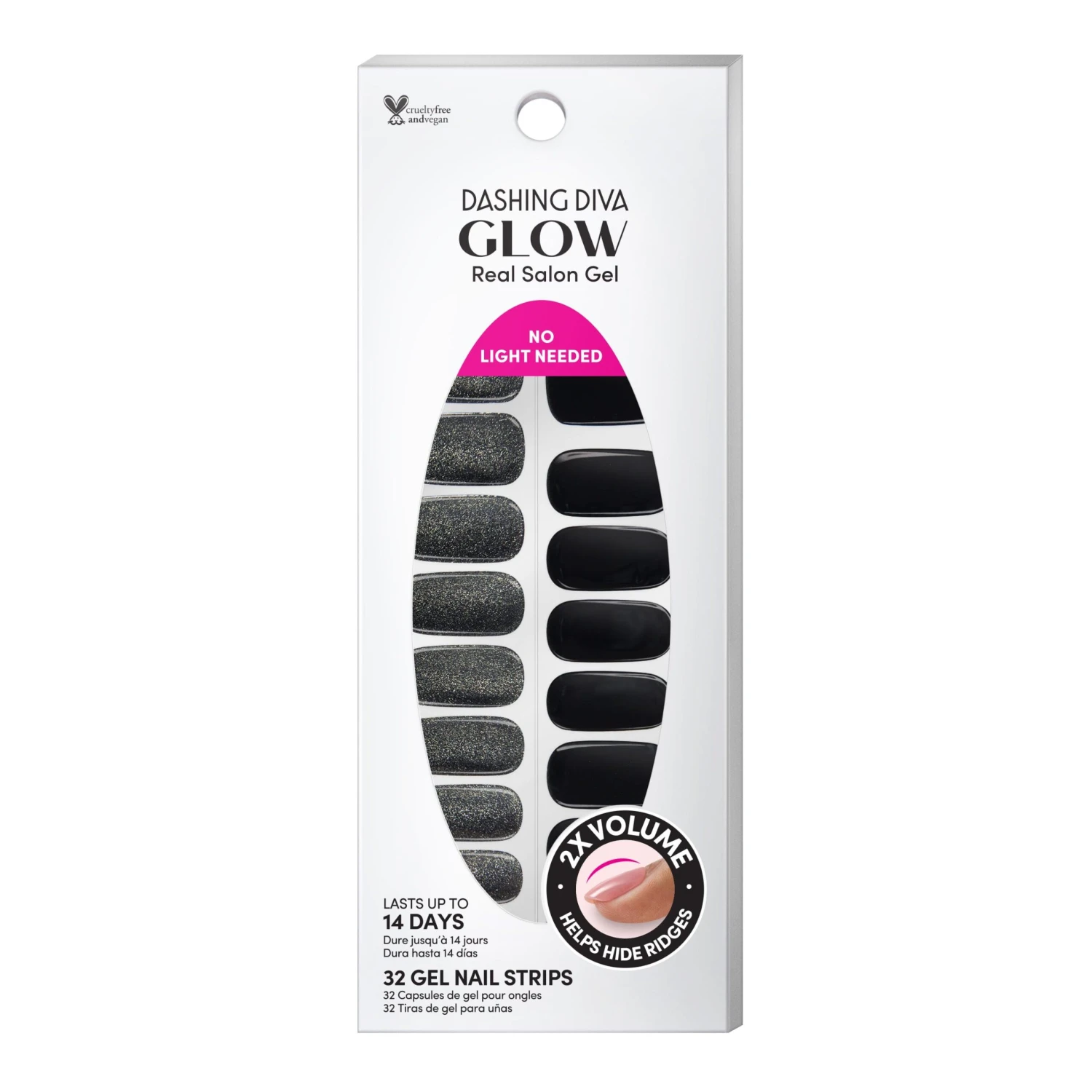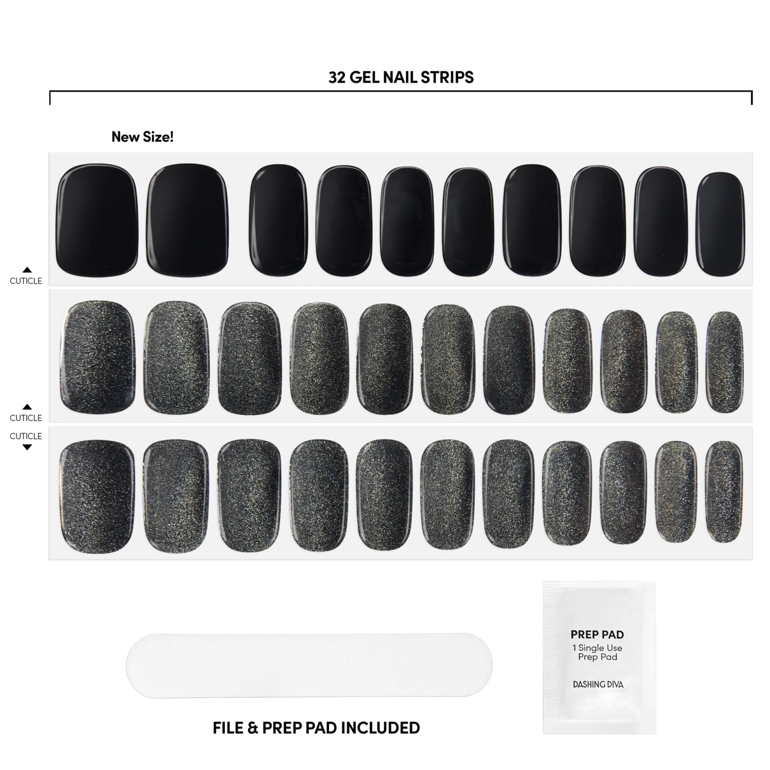 Black gel nail strips featuring a shimmery velvet effect with a double gel formula for an ultra-smooth finish.