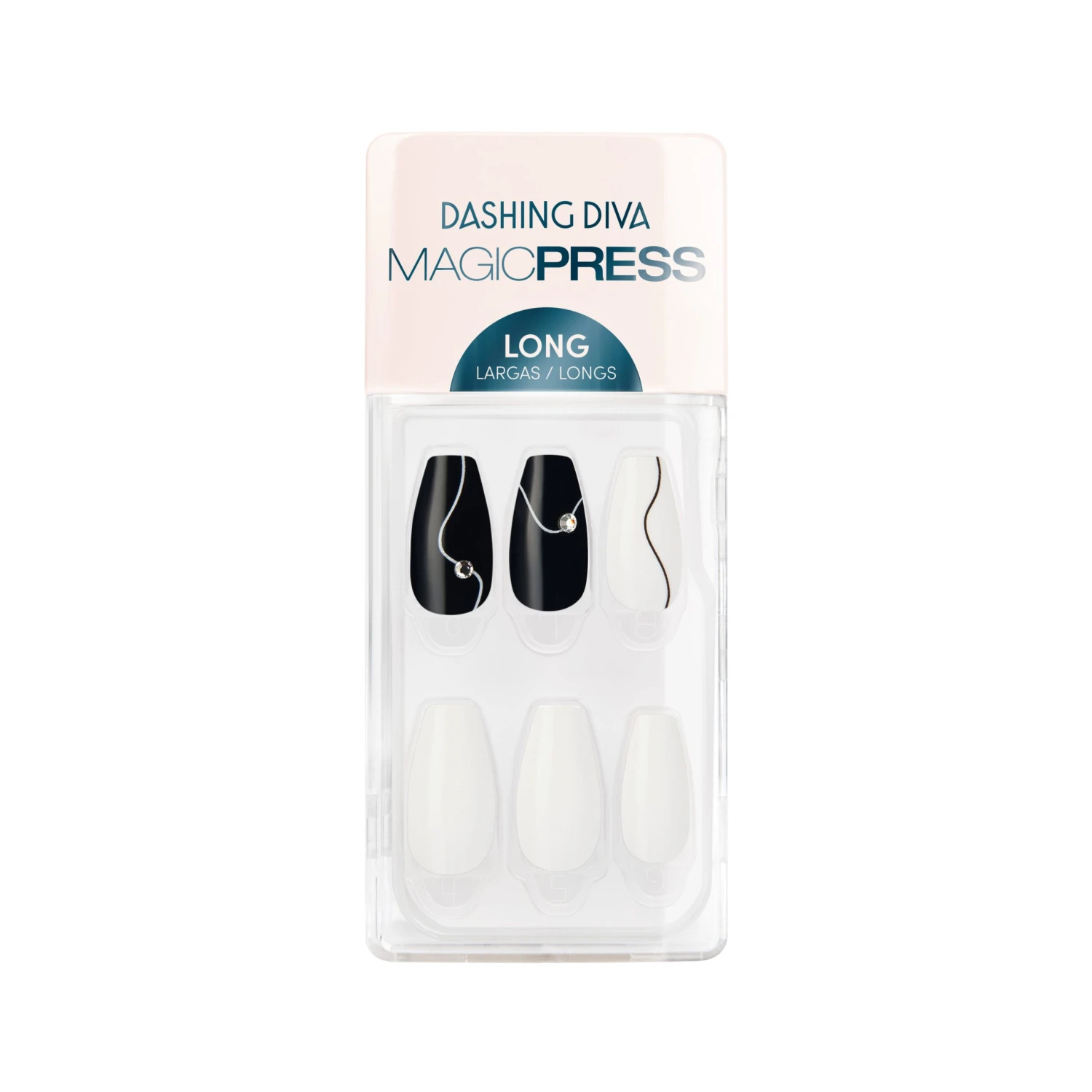 Long length, coffin shape, glossy finish black & white press-on gel nails featuring rhinestones and dainty, wavy abstract line art.