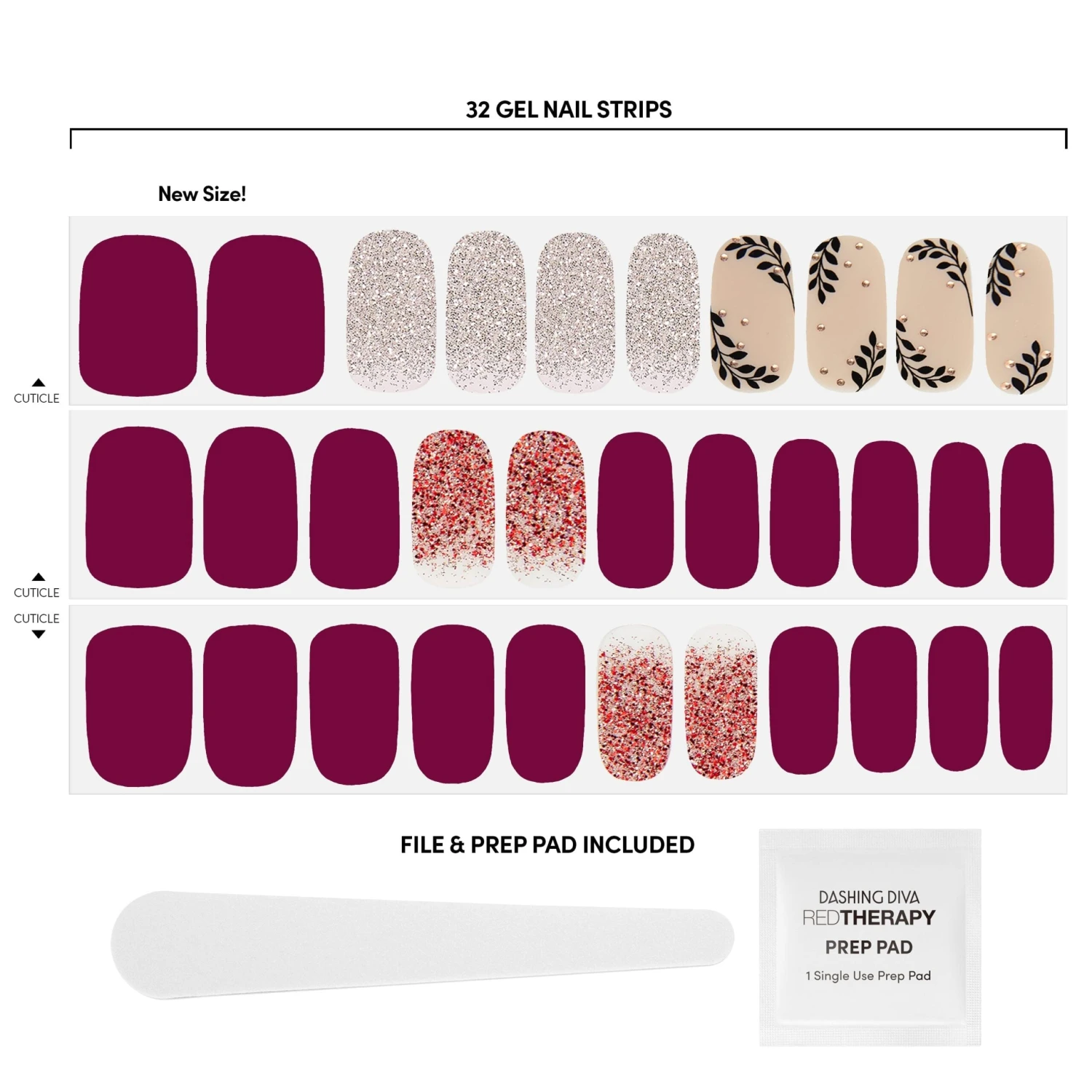 Cranberry red gel nail strips featuring red & silver ombré glitter, 3D rose gold studs, and leafy accents with a glossy, high-shine finish.
