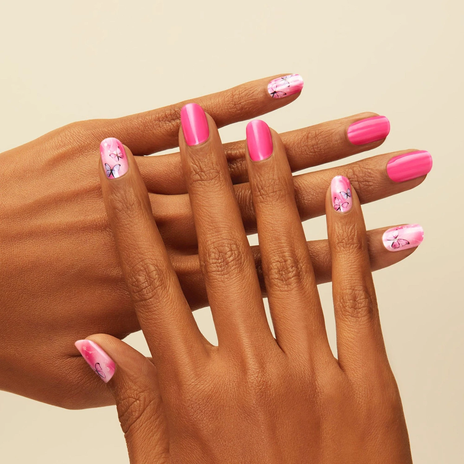 Hot pink & light pink gel nail strips featuring iridescent confetti glitter and butterfly accents with a double gel formula for an ultra-smooth finish.