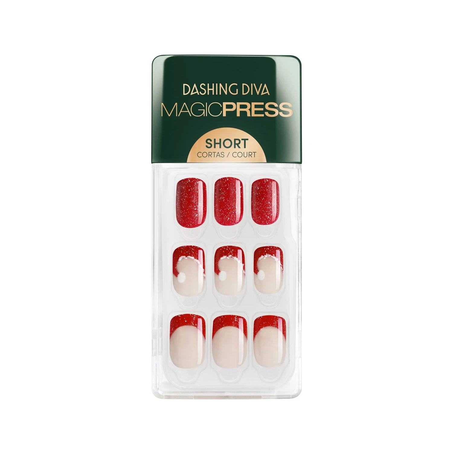 Press-on the perfect pitch! Short length, square shape, glossy finish. Sheer nude press-on gel nails featuring glittered red Santa hat french tips.