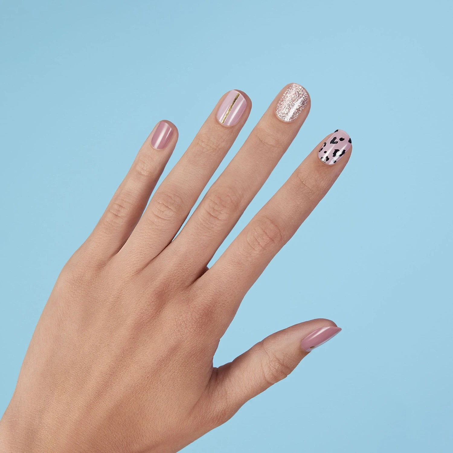 Semi-cured shades of pink gel nail strips featuring rose gold glitter, cheetah print, and gold foil accents with mega volume & maximum shine.