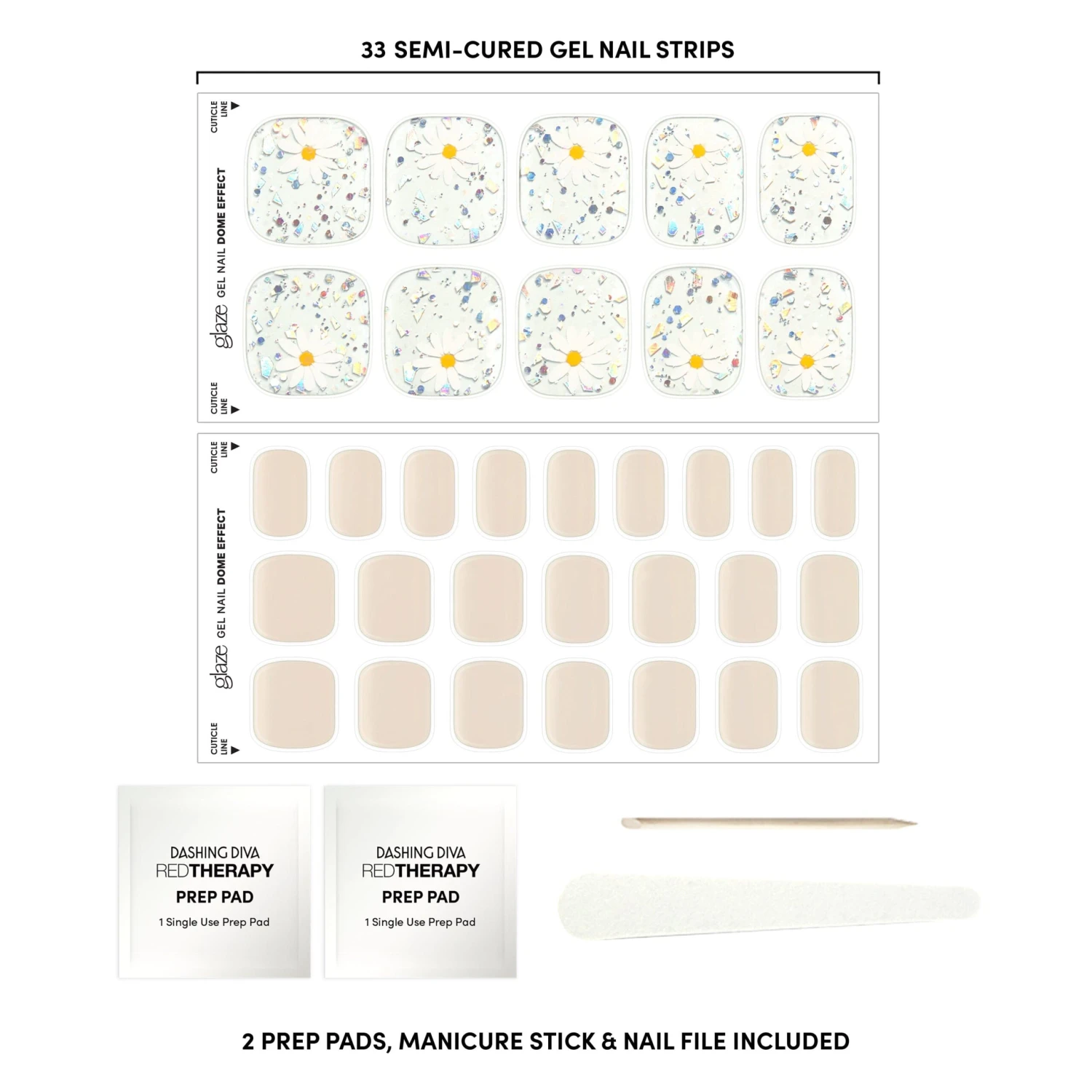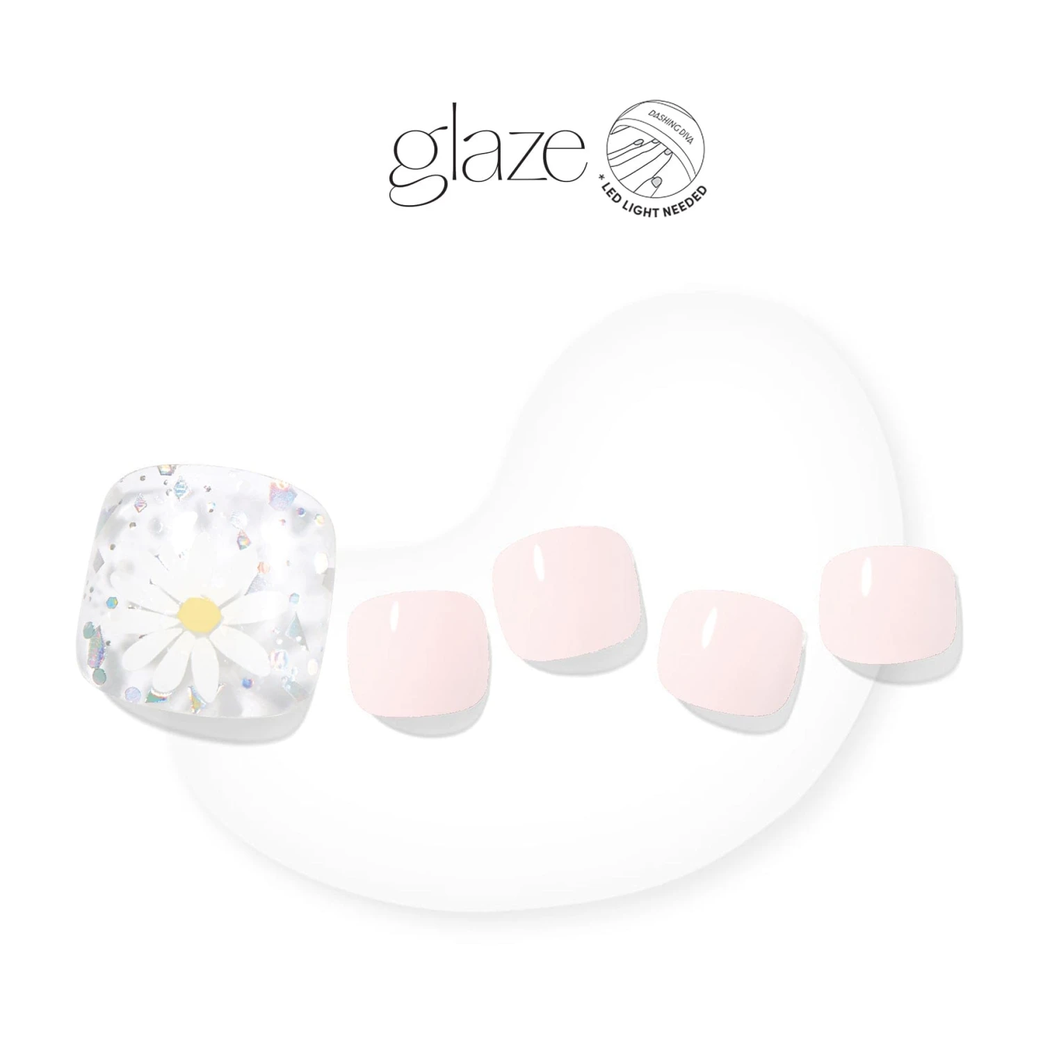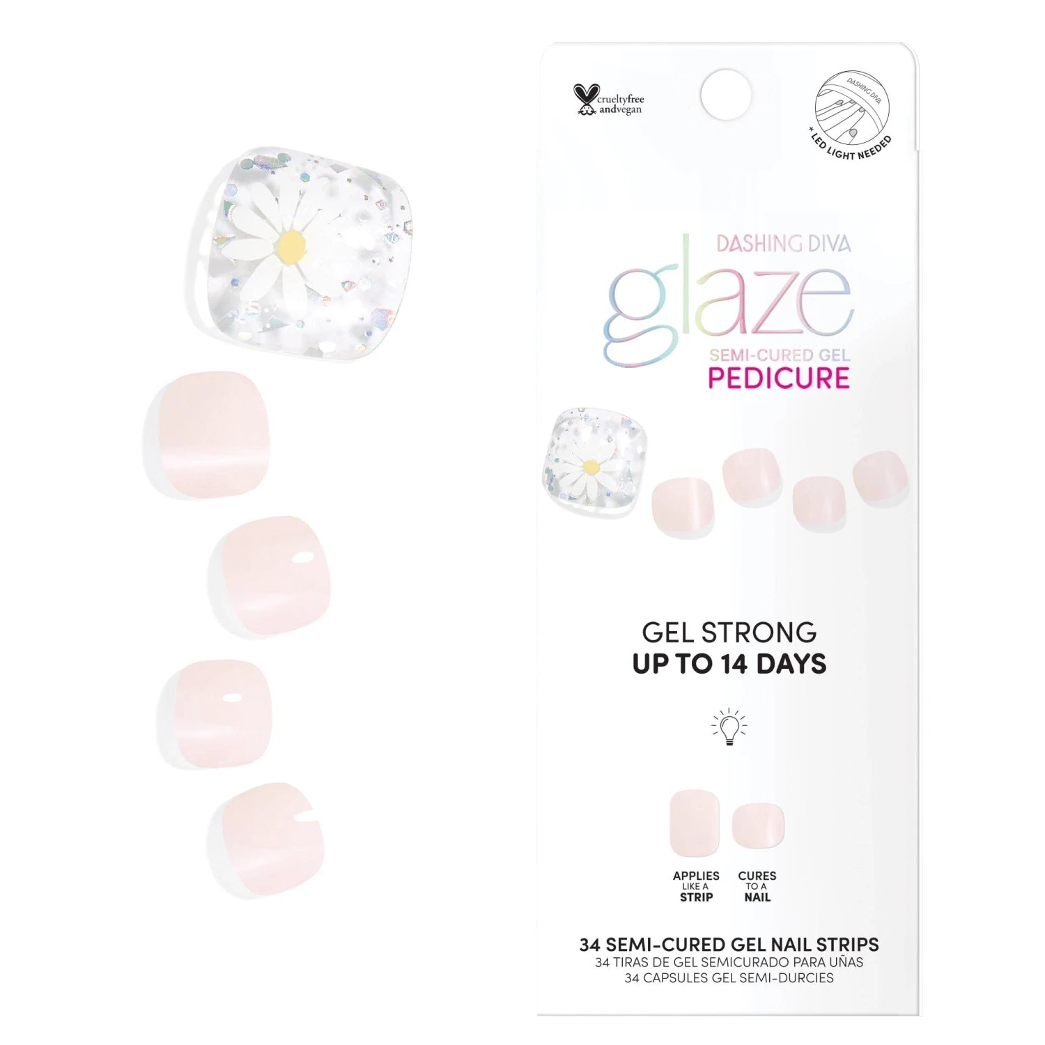 Semi-cured clear and pale blush gel pedicure strips featuring daisies and iridescent mosaic accents with mega volume & maximum shine.