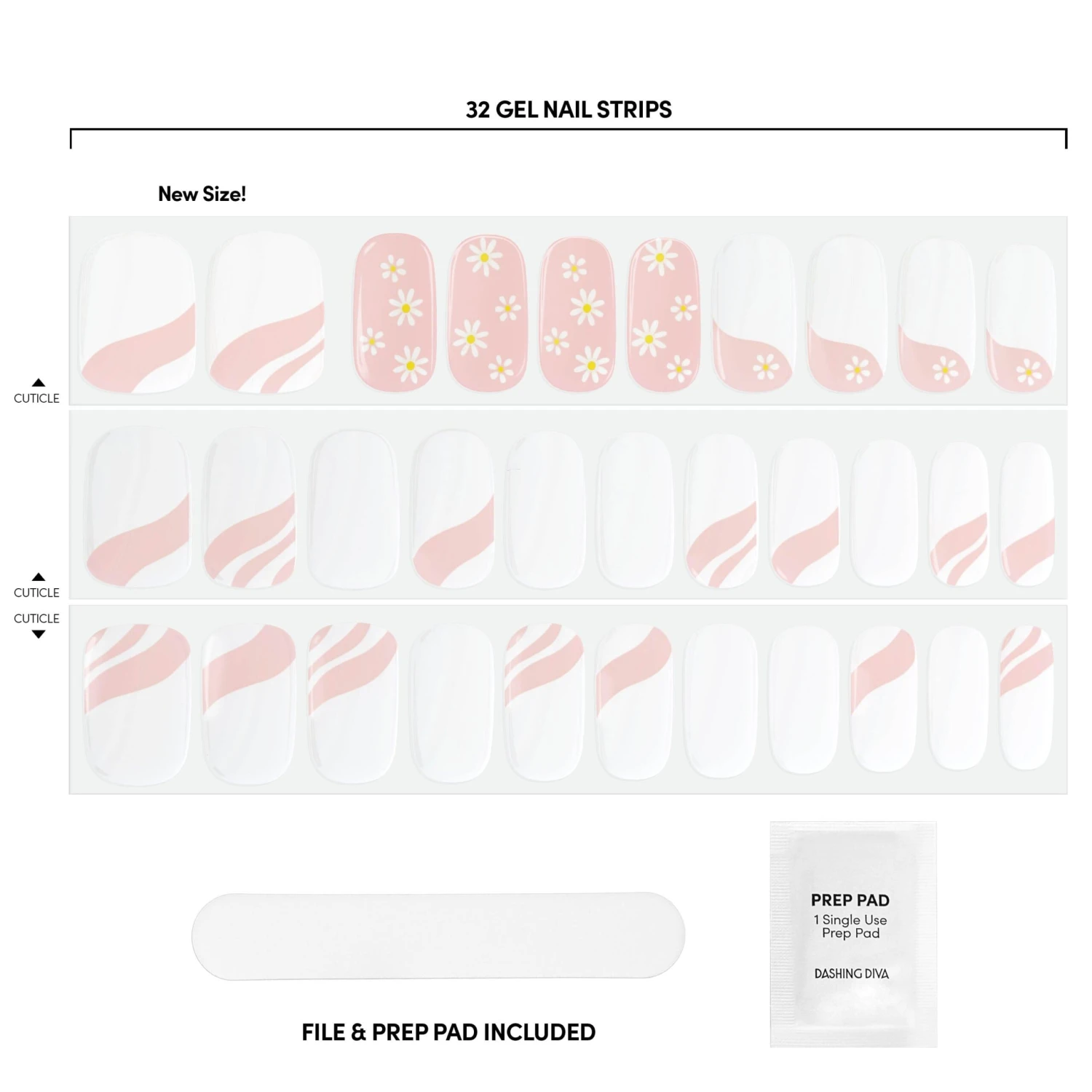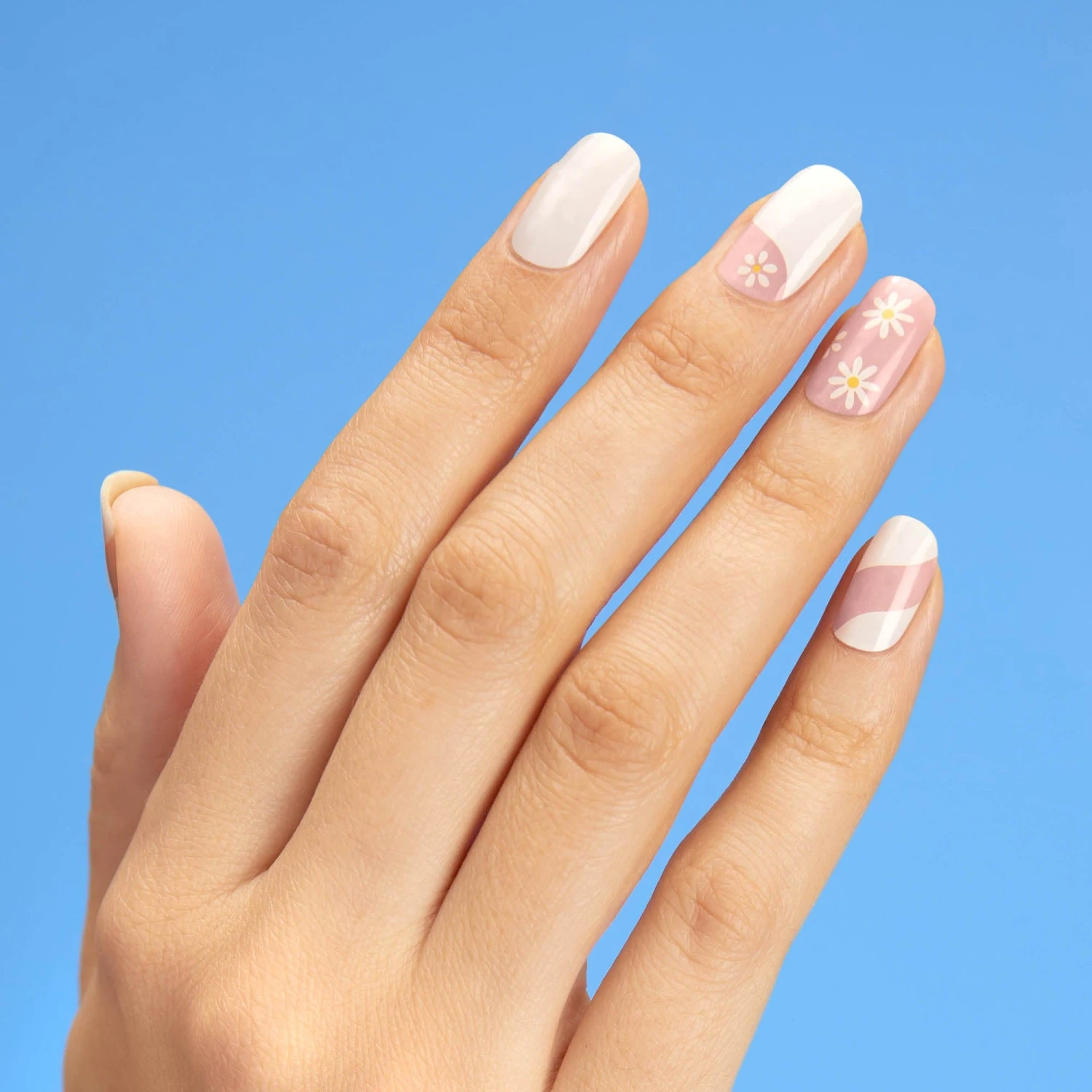 Nude and white gel nail strips featuring abstract swirls and daisy accents with a double gel formula for an ultra-smooth finish.