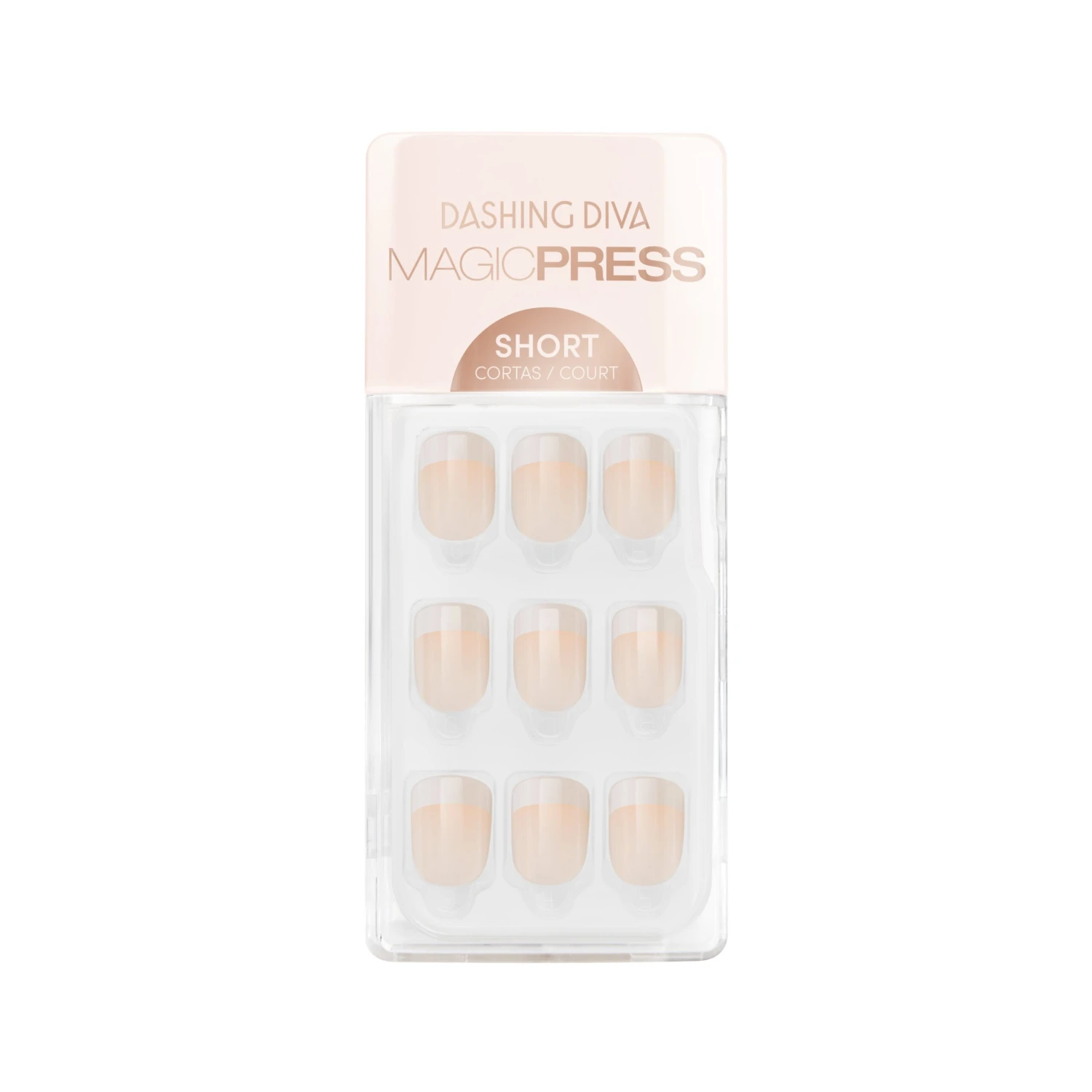 The classic French manicure proves itself to be undeniably glamorous, from day all the way into the night. Short length, square shape, glossy finish white French tip press-on gel nails with a light nude base.