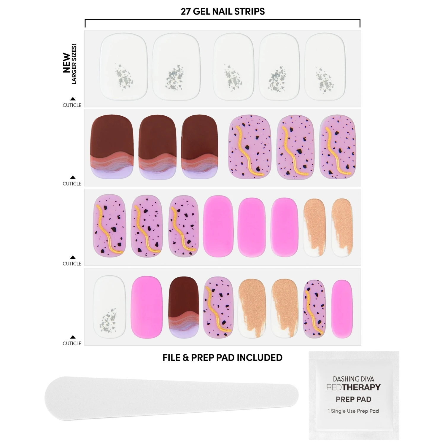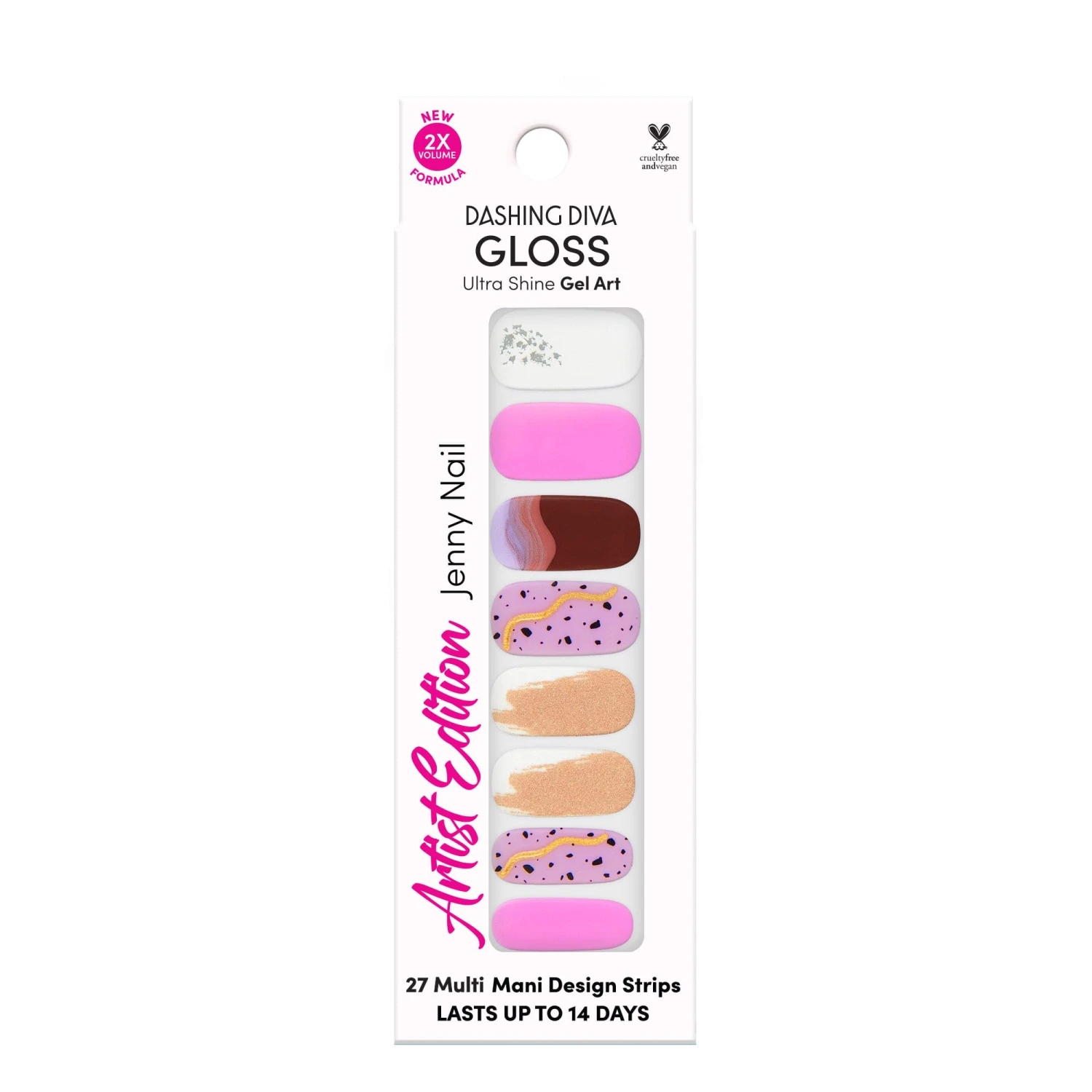 Ultra deluxe designs with double the volume and double the attraction. Multi-design gel nail strips featuring gold foil and iridescent mosaic pieces in pink and purple hues with 2x the volume of Gloss and its original, high-shine finish. Features nail art created by nail artist Jenny Nail, in collaboration with Dashing Diva.