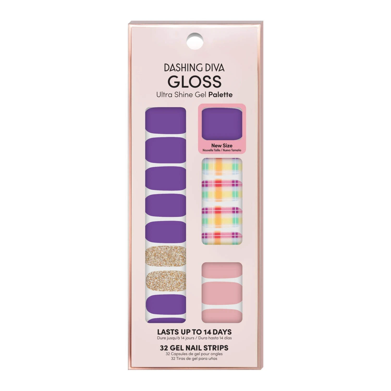 Be the coolest kid on the field trip with cool purple, mauve pink, and gold glitter gel nail strips featuring a playful rainbow flannel print with a glossy, high-shine finish.