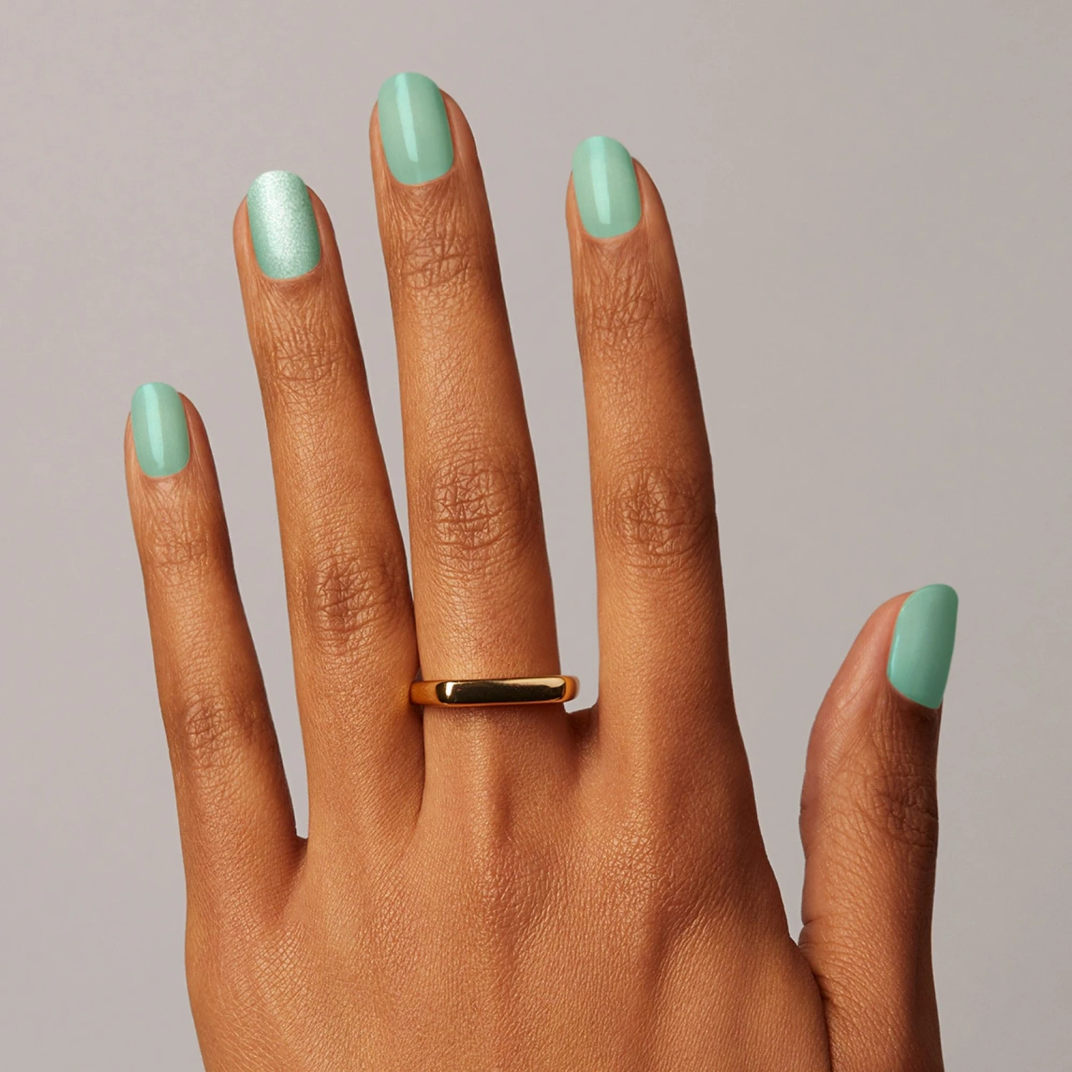 It’s top rated for a reason. Soft green gel nail strips featuring a velvet shimmer effect with a glossy, high-shine finish.