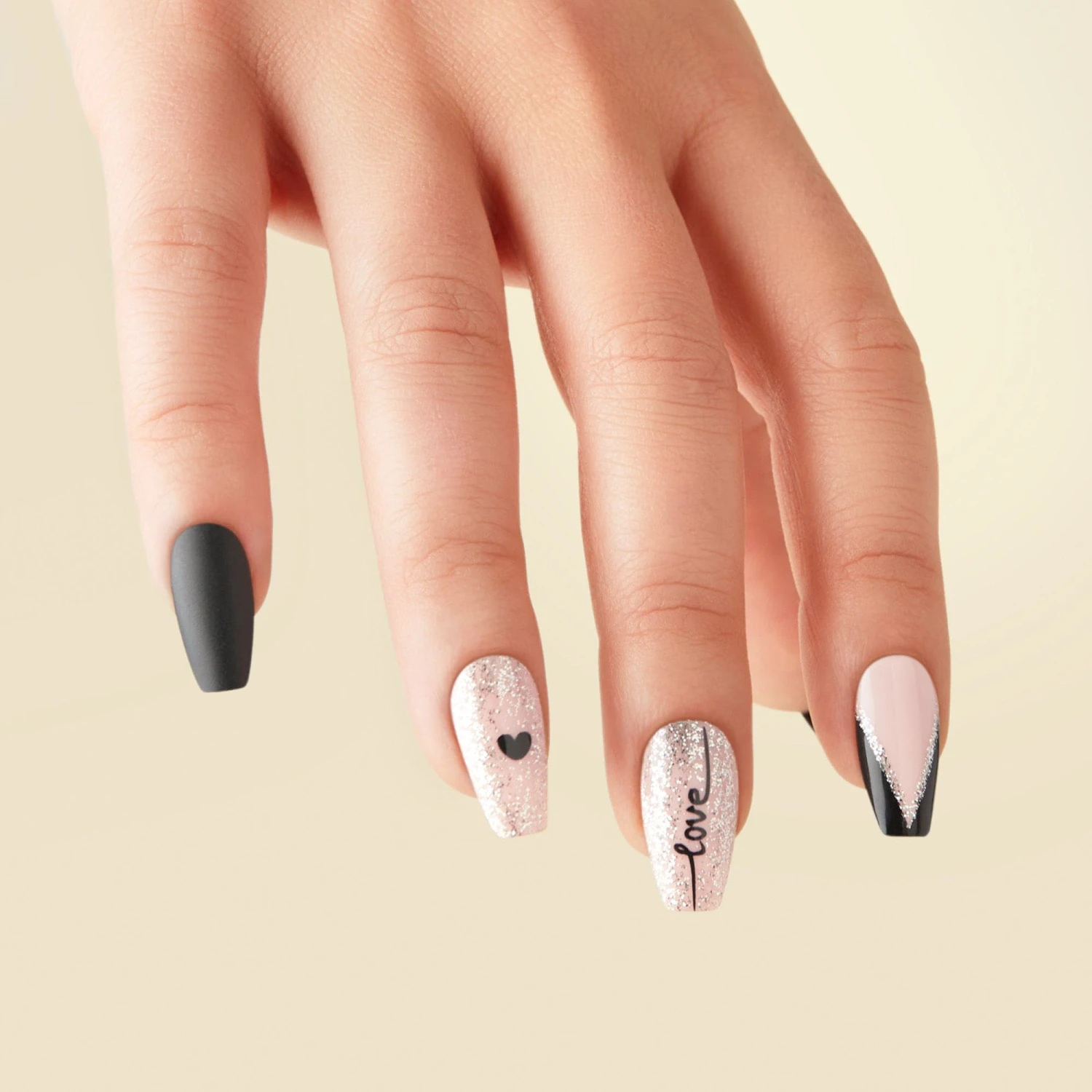 Long length, coffin shape, glossy finish black, and nude press-on nails. Featuring silver glitter and cursive love letters.
