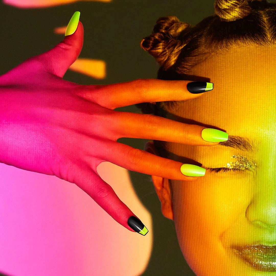 If you’re looking for a next-level press-on manicure, black, neon, and coffin shape make a victorious team. The game is now over. Long length, coffin shape, glossy finish black & neon yellow press-on gel nails featuring neon yellow French tips.