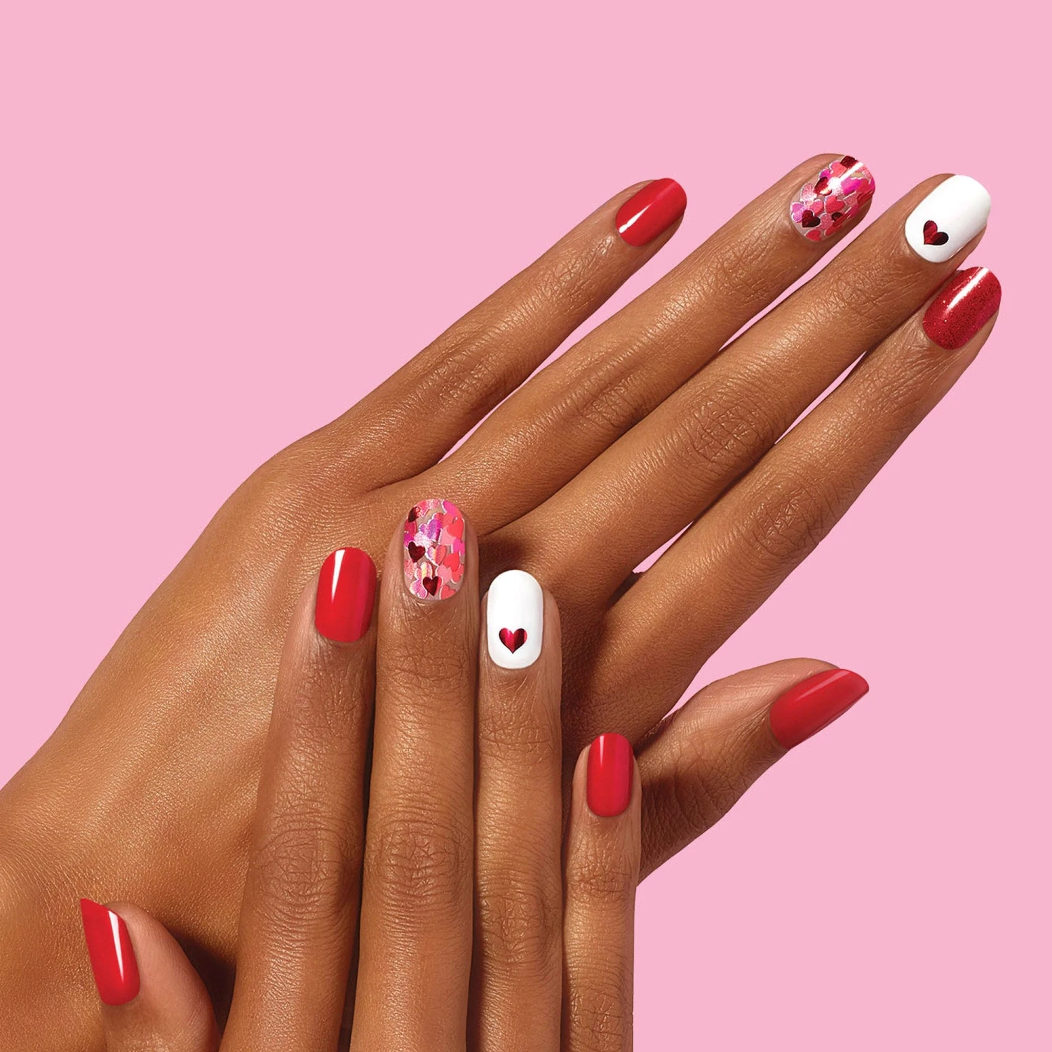 Is your girl crush on me or my mani? Red & white gel nail strips featuring red glitter and multicolor foil hearts with a glossy, high-shine finish.