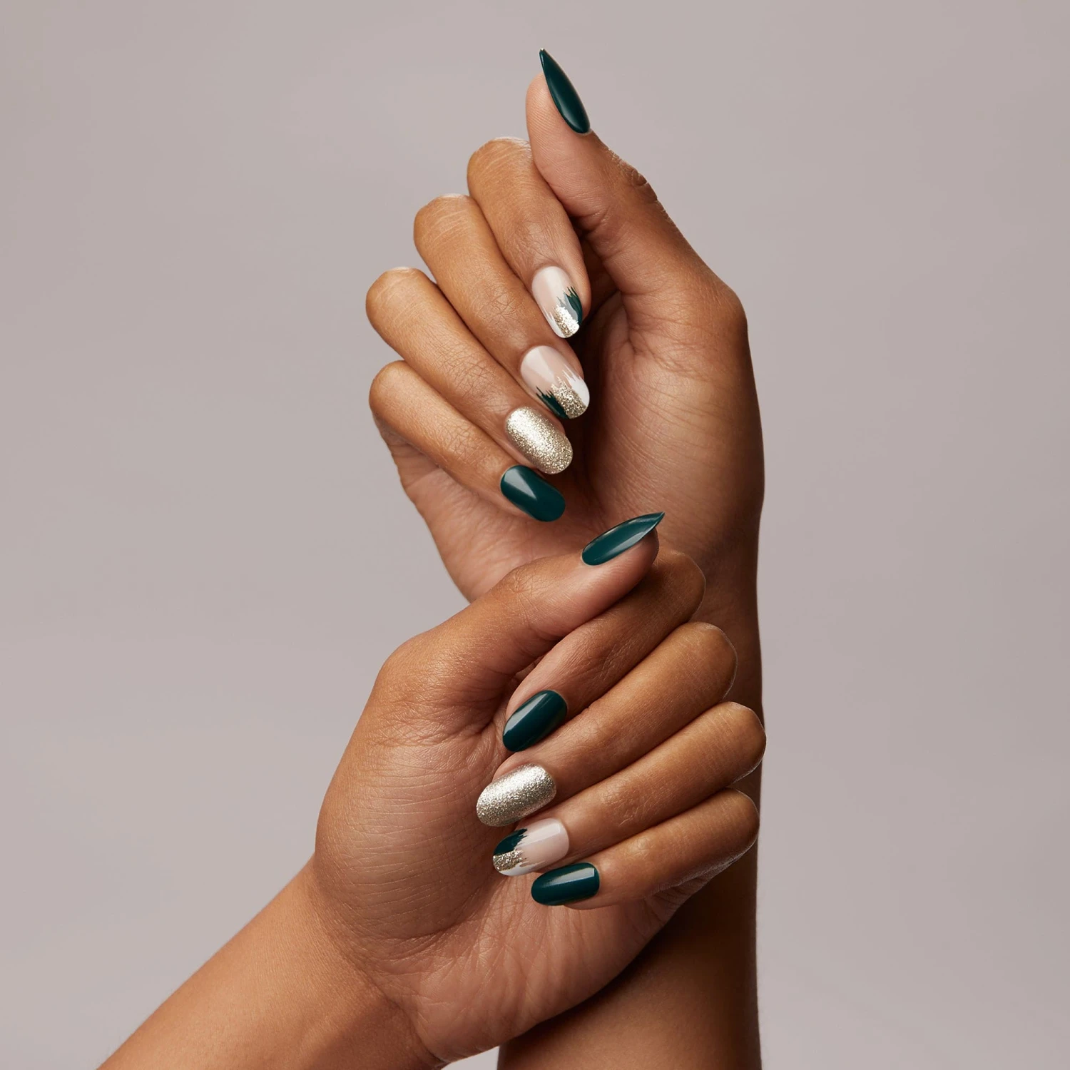 Medium length, oval shape, glossy finish. Deep green & semi-sheer nude press-on gel nails featuring gold glitter and airbrush french tip accents.