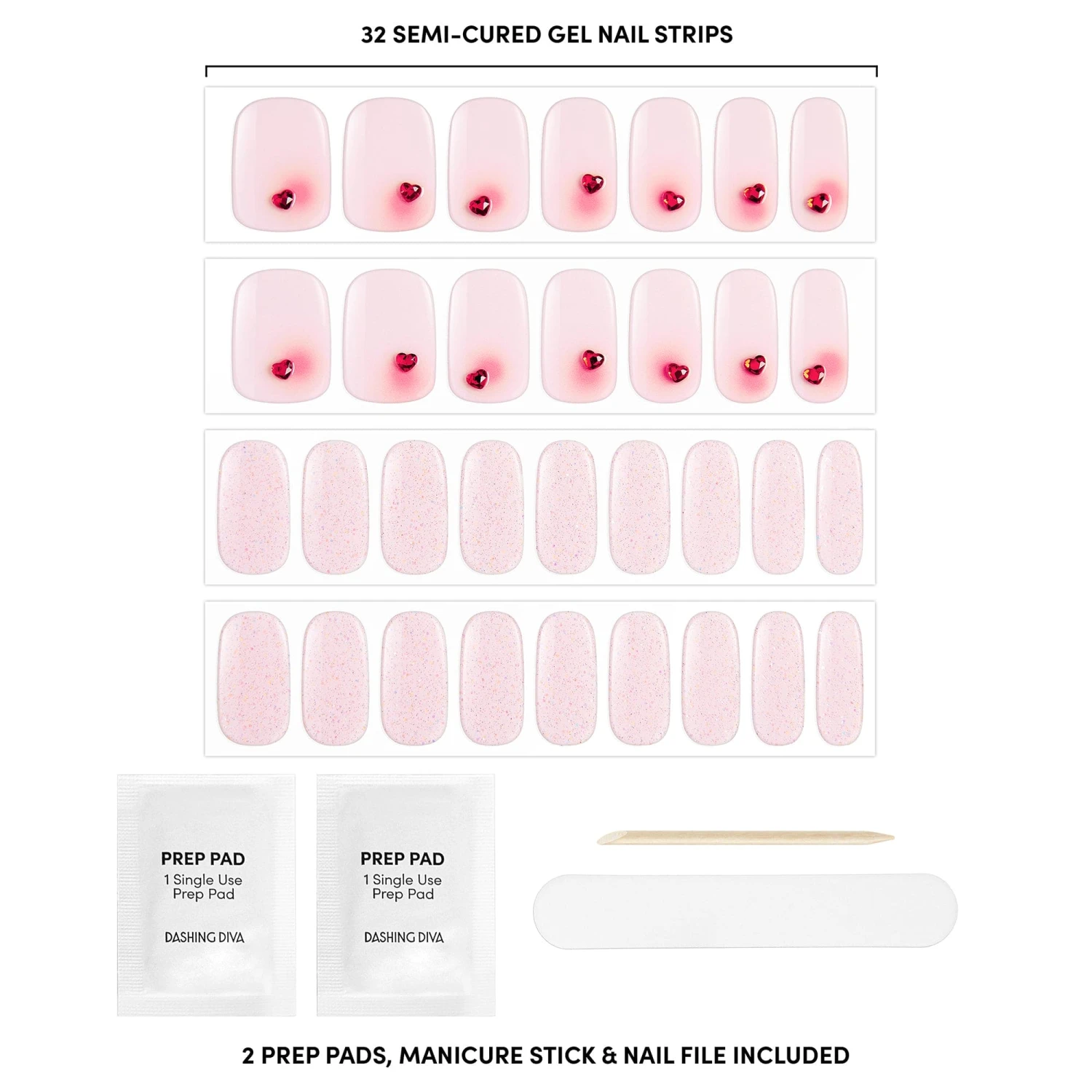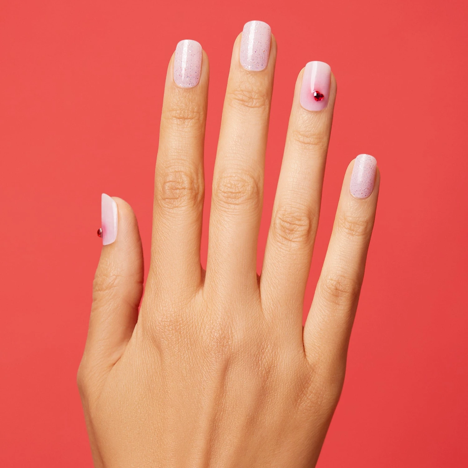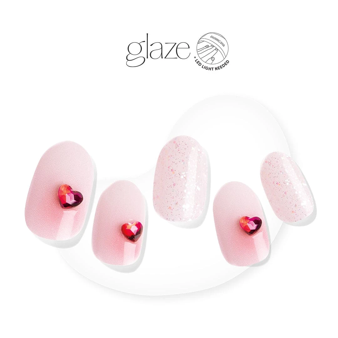 Glam even when you’re going through it. Semi-cured nude pink gel nail strips featuring iridescent glitter, heart-shaped gems, and red ombré accents with mega volume and maximum shine.