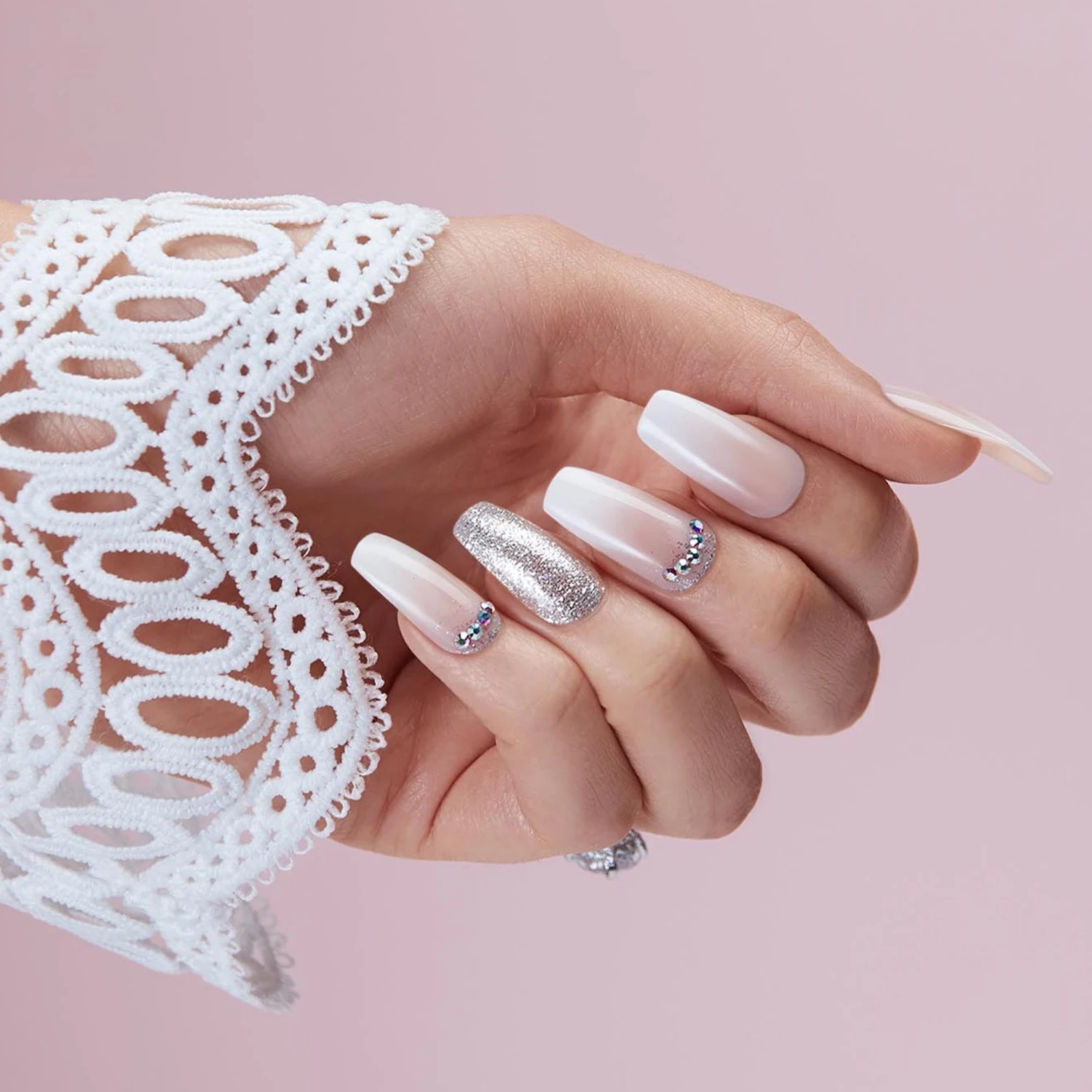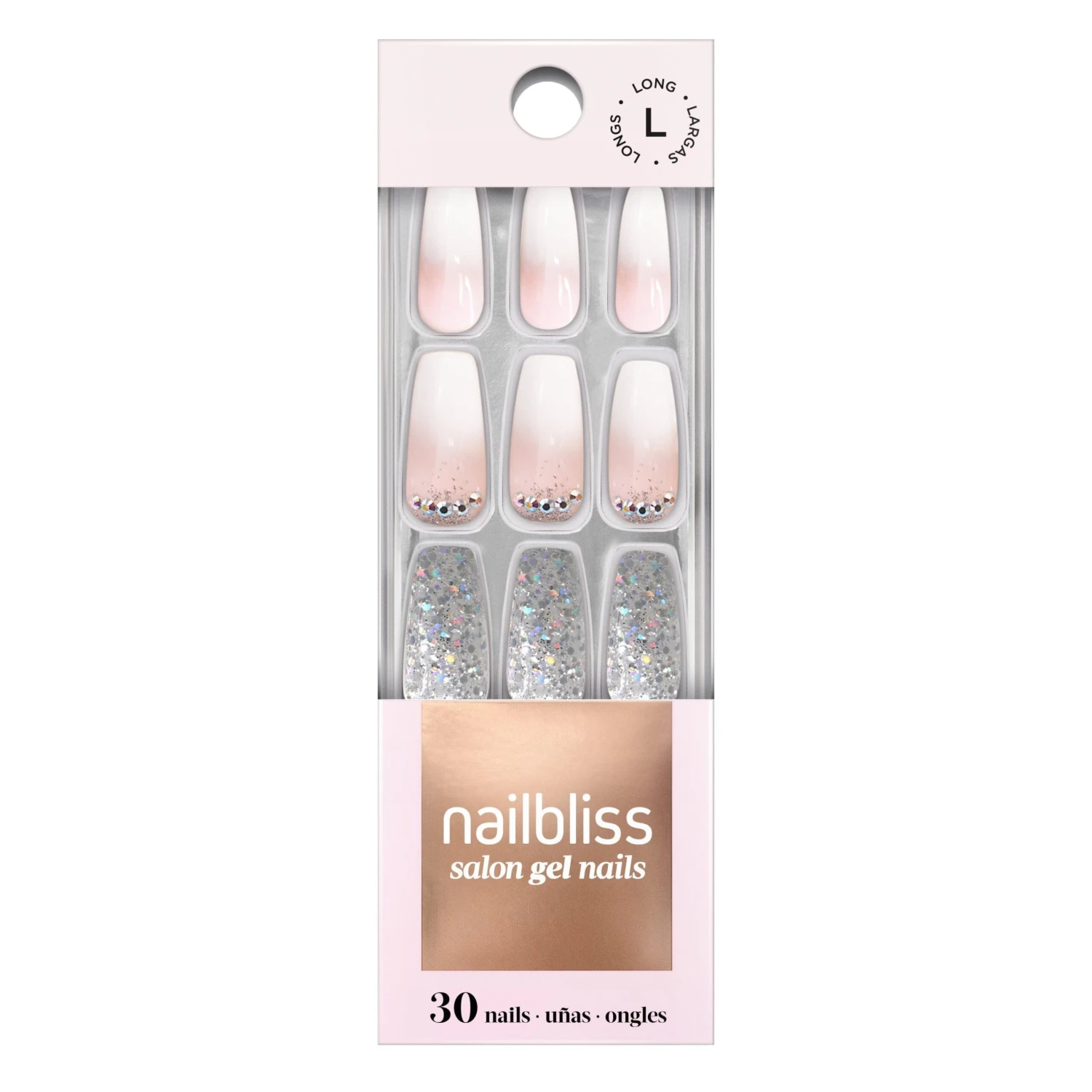 That length and that bling shows that you’re here to slay. Long length, coffin shape, glossy finish nude pink glue-on gel nails featuring ombré French tips, rhinestones, and iridescent confetti glitter with salon strength & professional shine.