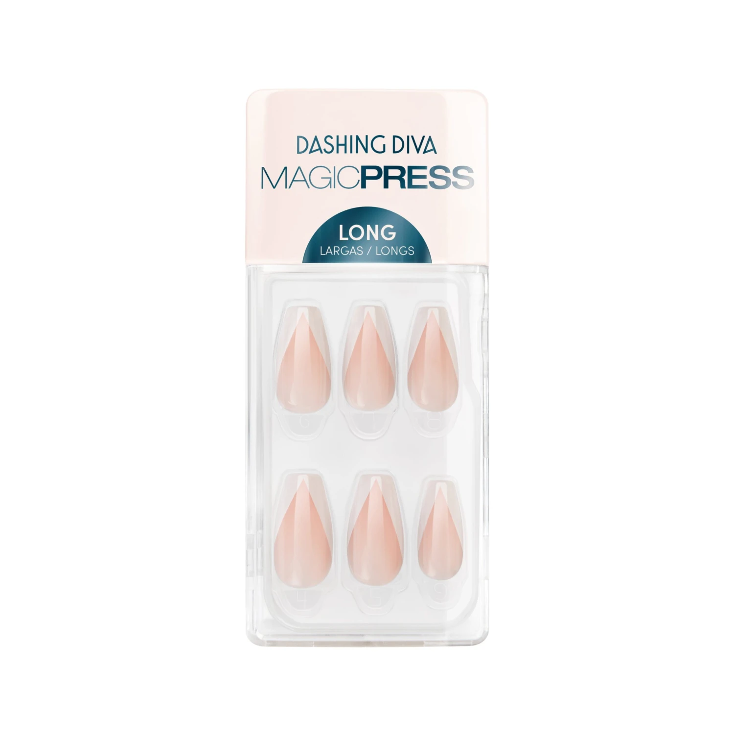 The ‘Hollywood’s Finest’ of our French manicure collection. Long length, coffin shape, glossy finish nude pink press-on gel nails featuring a sharp white French tip.