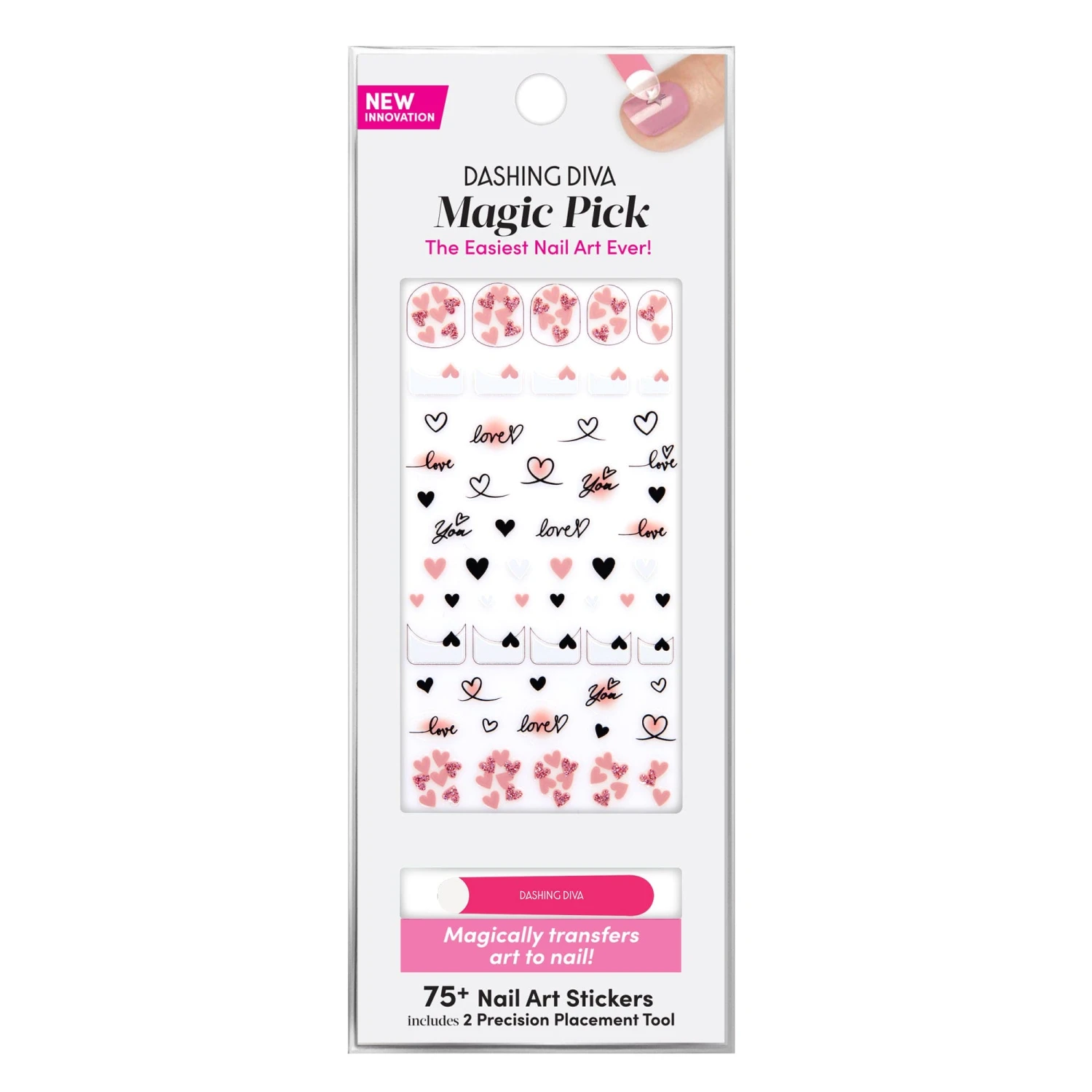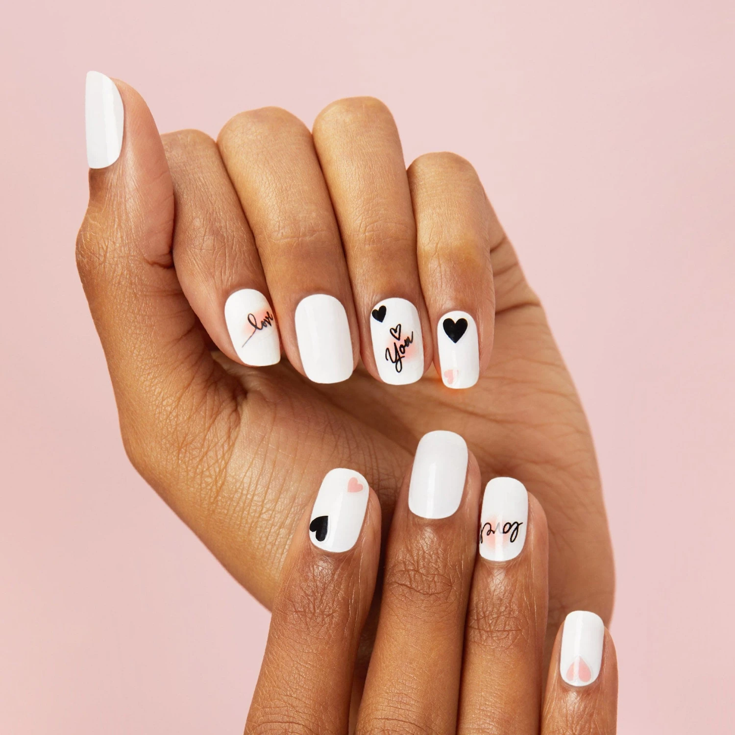 Premium nail art stickers featuring expressive designs, including French tips with black and blush accents, glitter-filled hearts, and love notes.