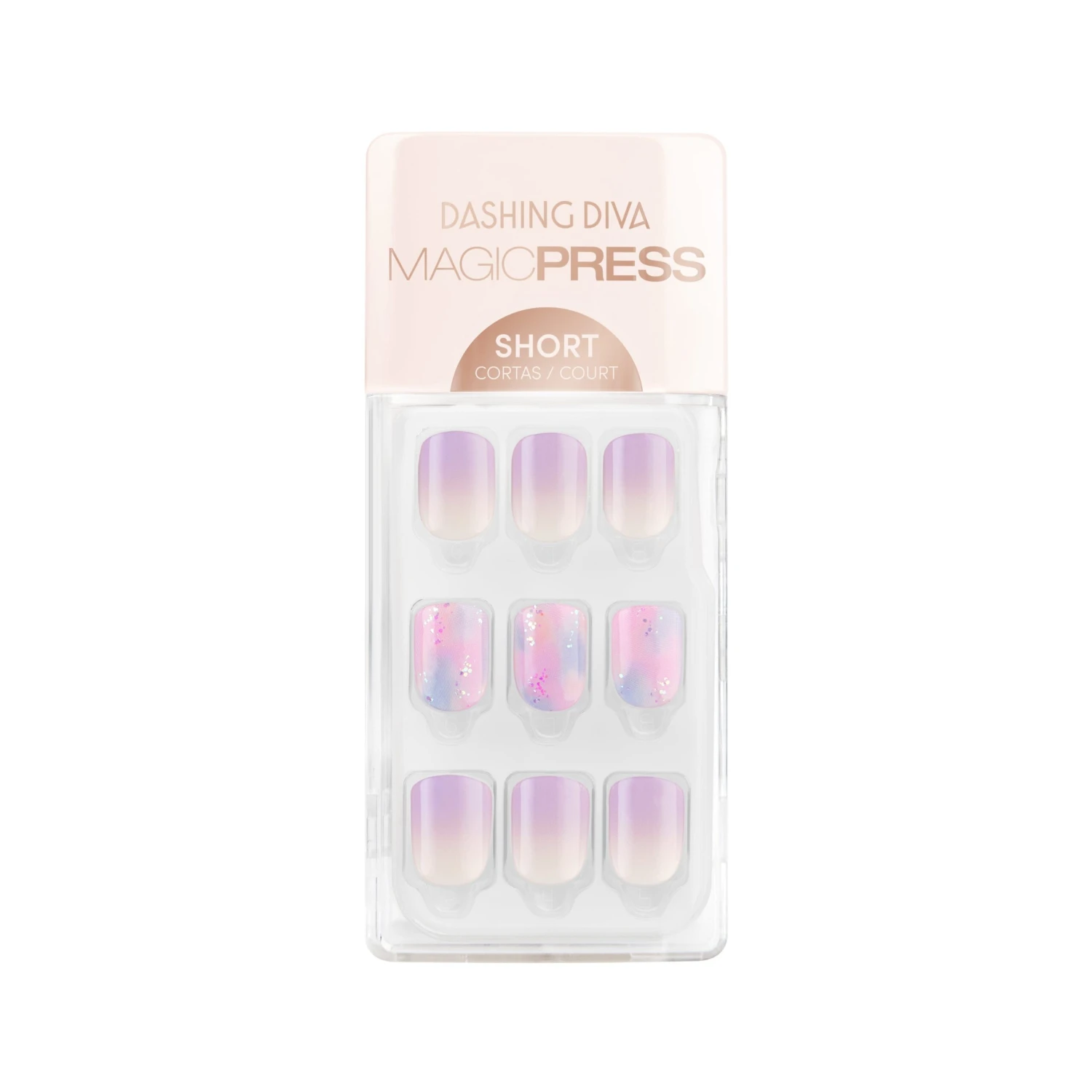 Short length, square shape, glossy finish press-on nails. Find Inner Peace with this soft purple, pink and nude nail look with an ombré effect.