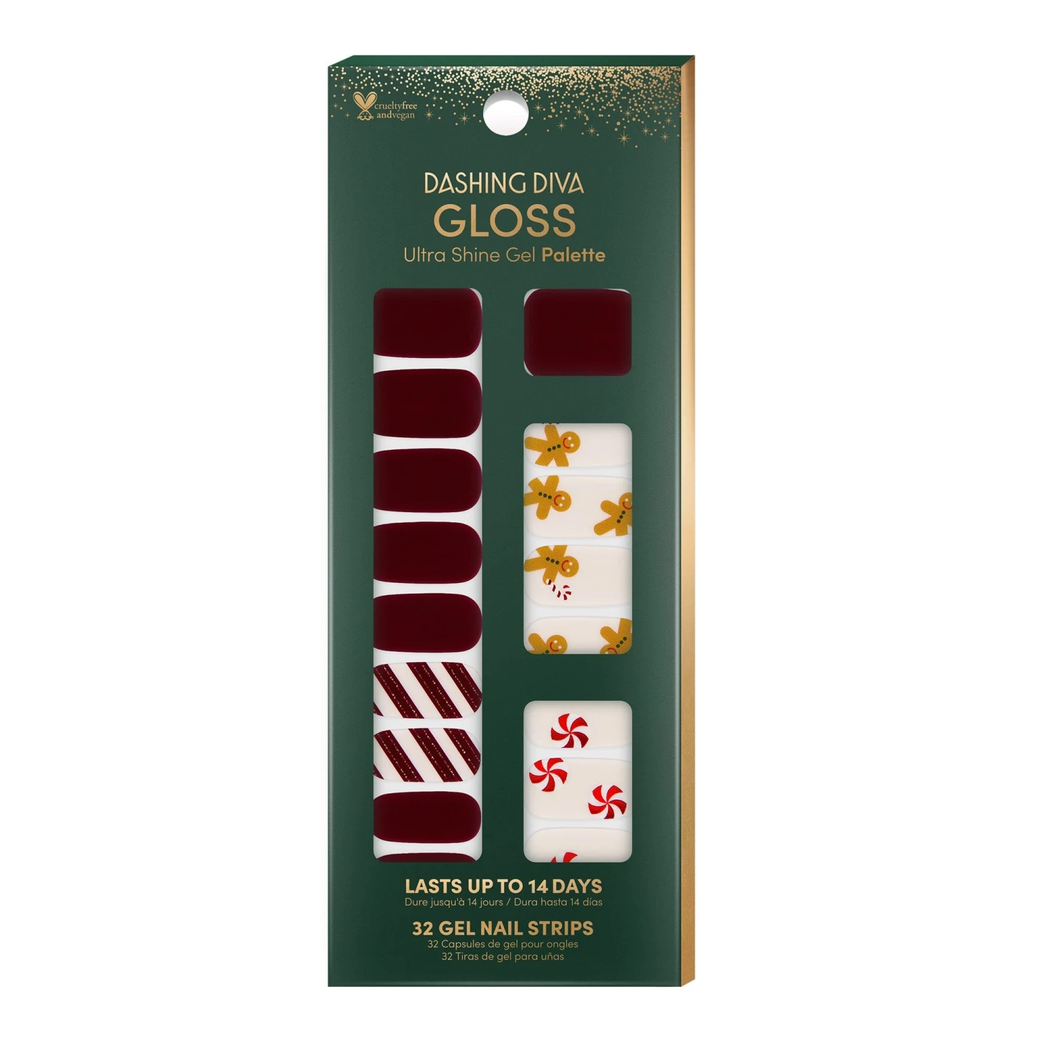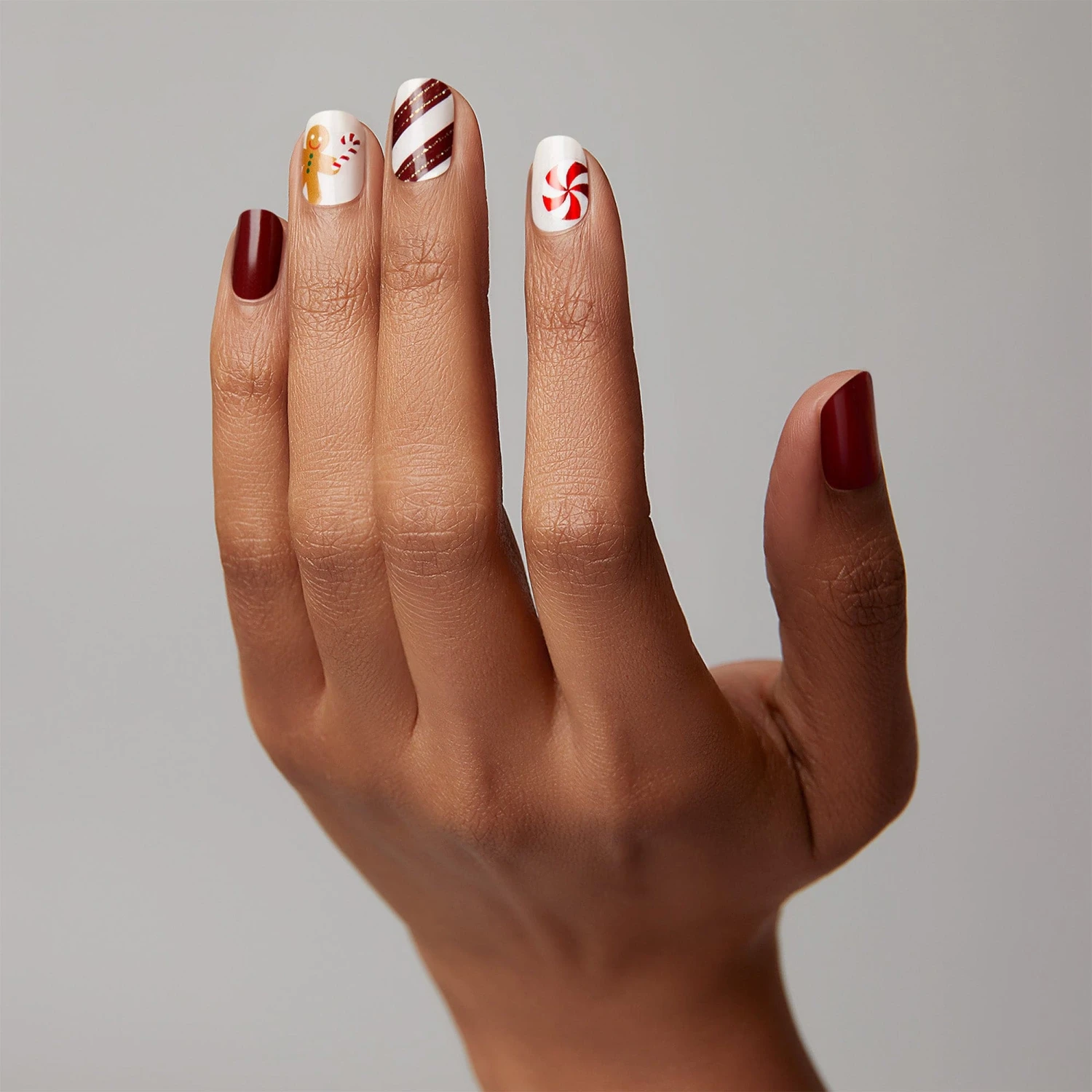 All in good fun, as always. Deep red and cream nail strips featuring gingerbread, candy canes, mints, and stripes with a glossy, high-shine finish.