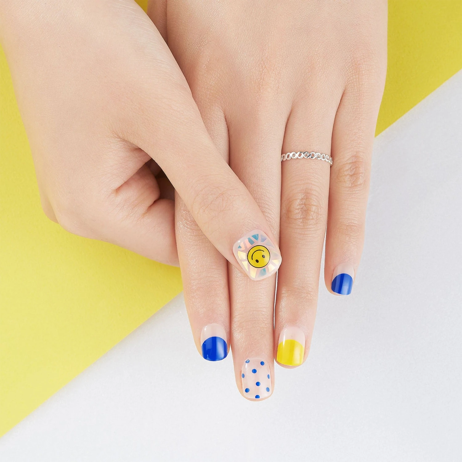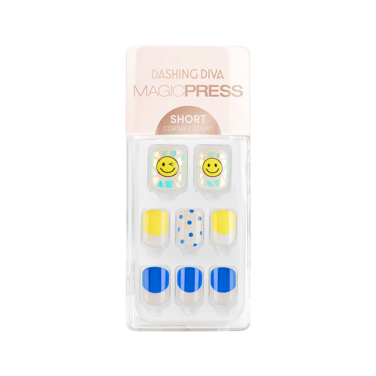Not a ray short of bright & cheery! Short length, square shape, glossy finish clear press-on gel nails featuring smiley faces, iridescent mosaic pieces, and blue & yellow half moon French tip accents.