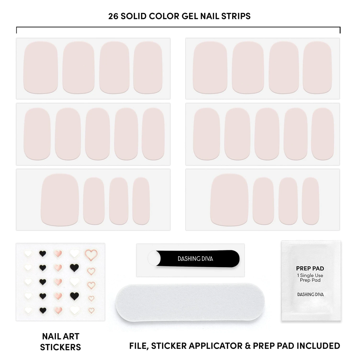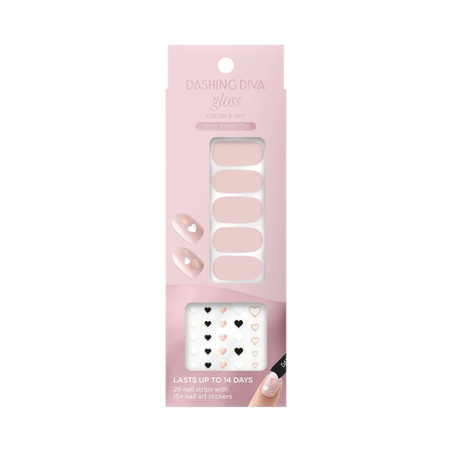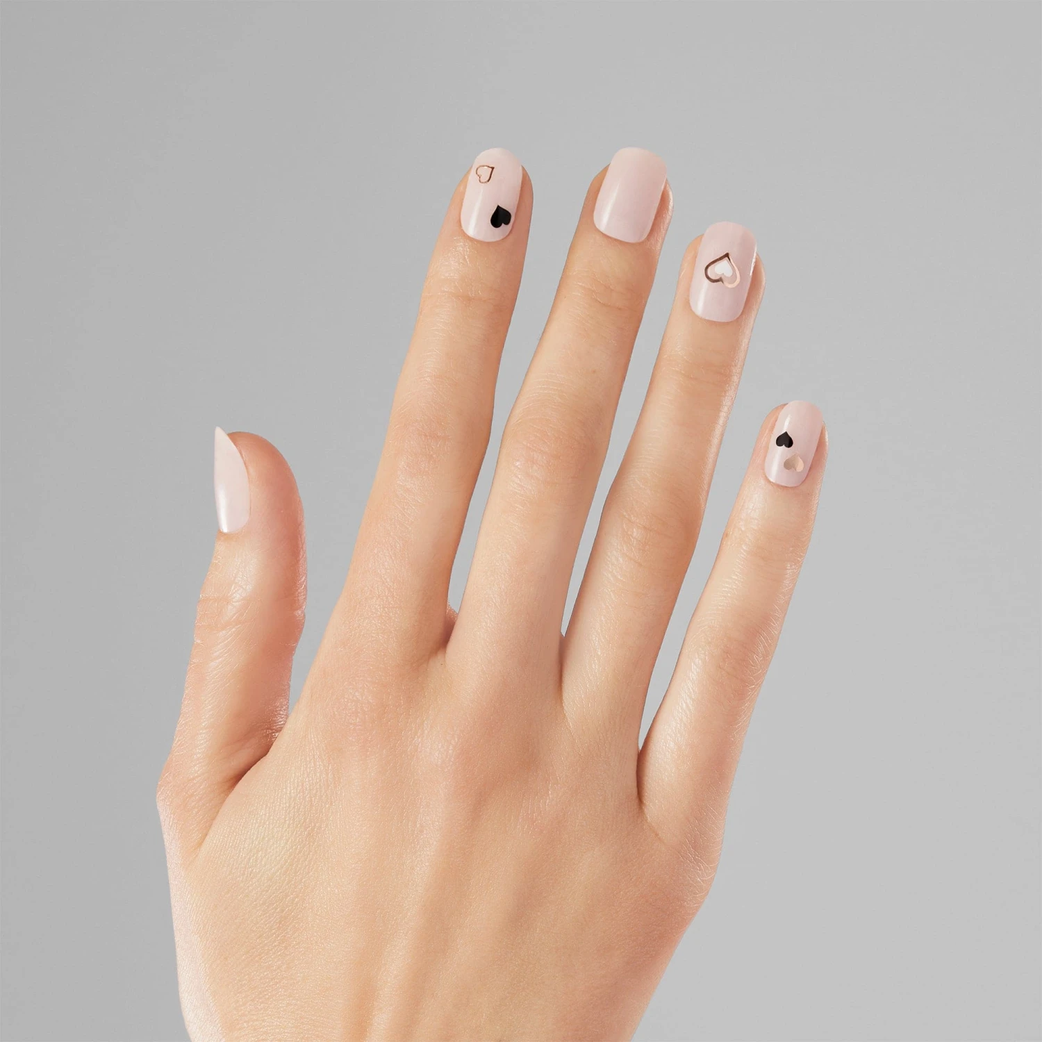 Love and manis make the world go round. Sheer baby pink gel nail strips and premium nail art stickers featuring black, white, and metallic rose gold hearts.