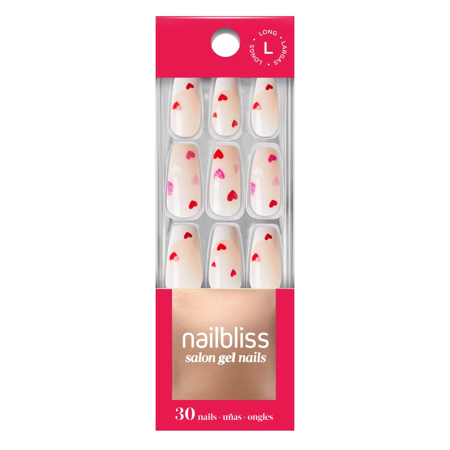 Long length, coffin shape, glossy finish nude & white glue-on nails featuring a white French tip and floating hearts with salon strength & professional shine. Â