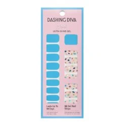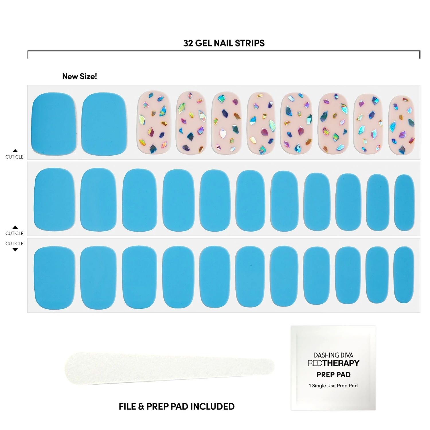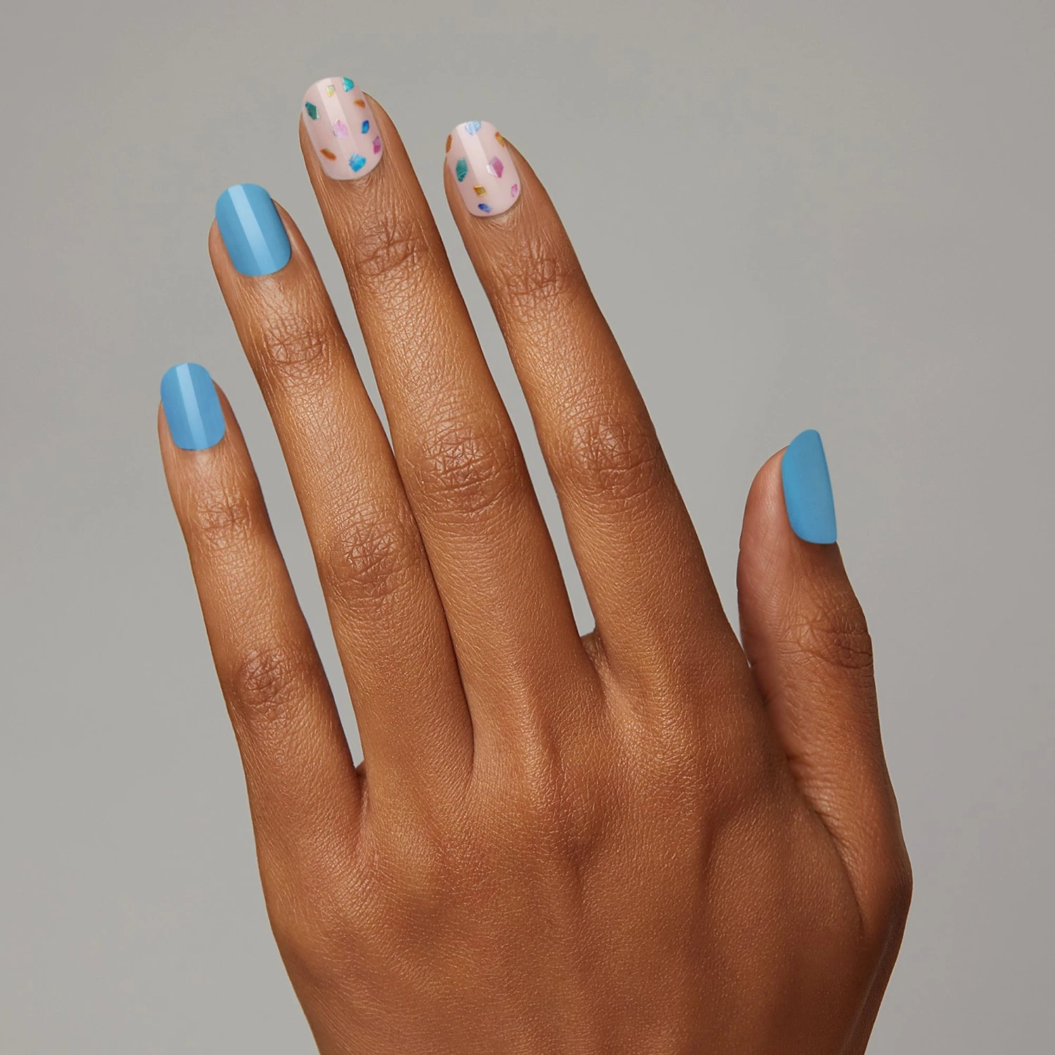 Now you see them, now you don’t… Bright blue & nude pink gel nail strips featuring multicolor mosaic accents with a glossy, high-shine finish.