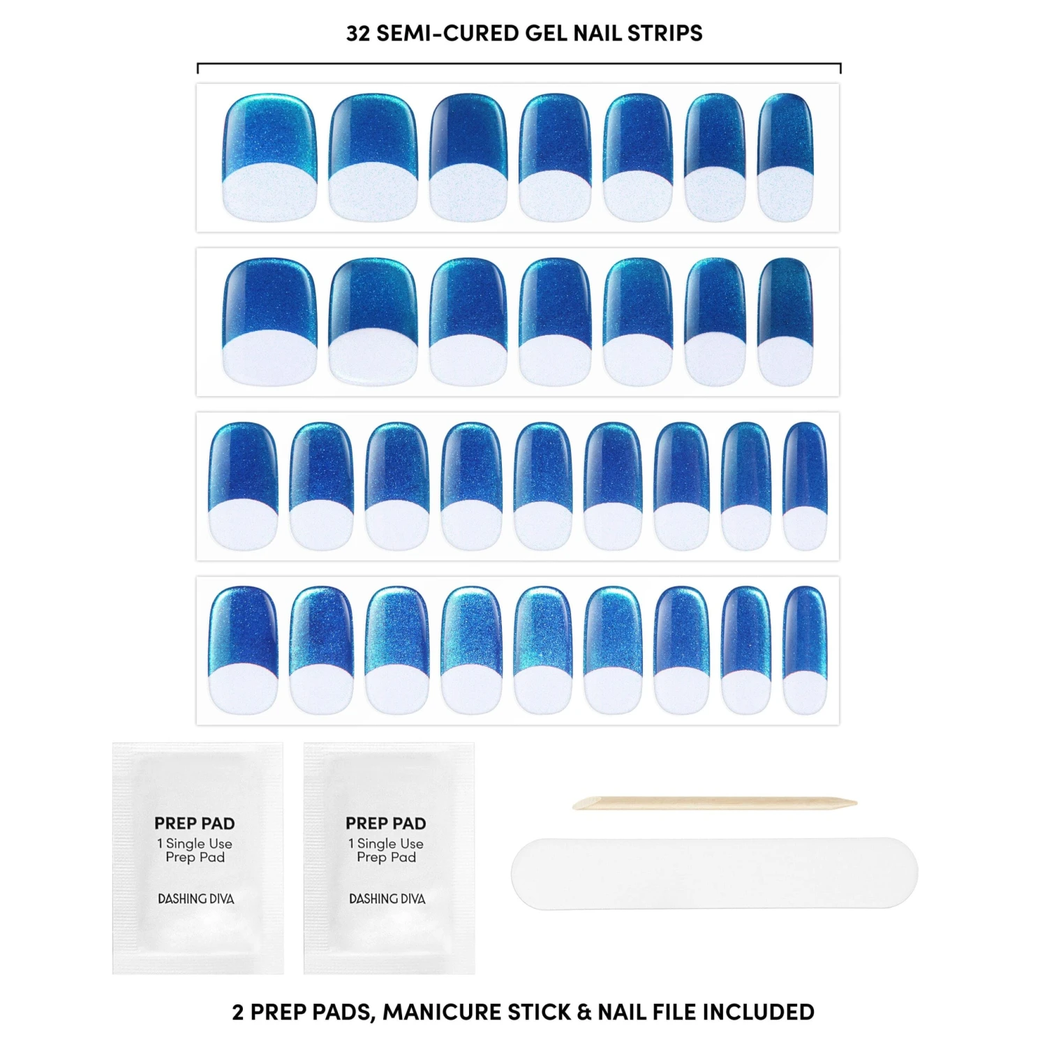 Semi-cured sheer nude gel nail strips featuring dark blue french tips and a shimmery, iridescent chrome finish with mega volume & maximum shine.