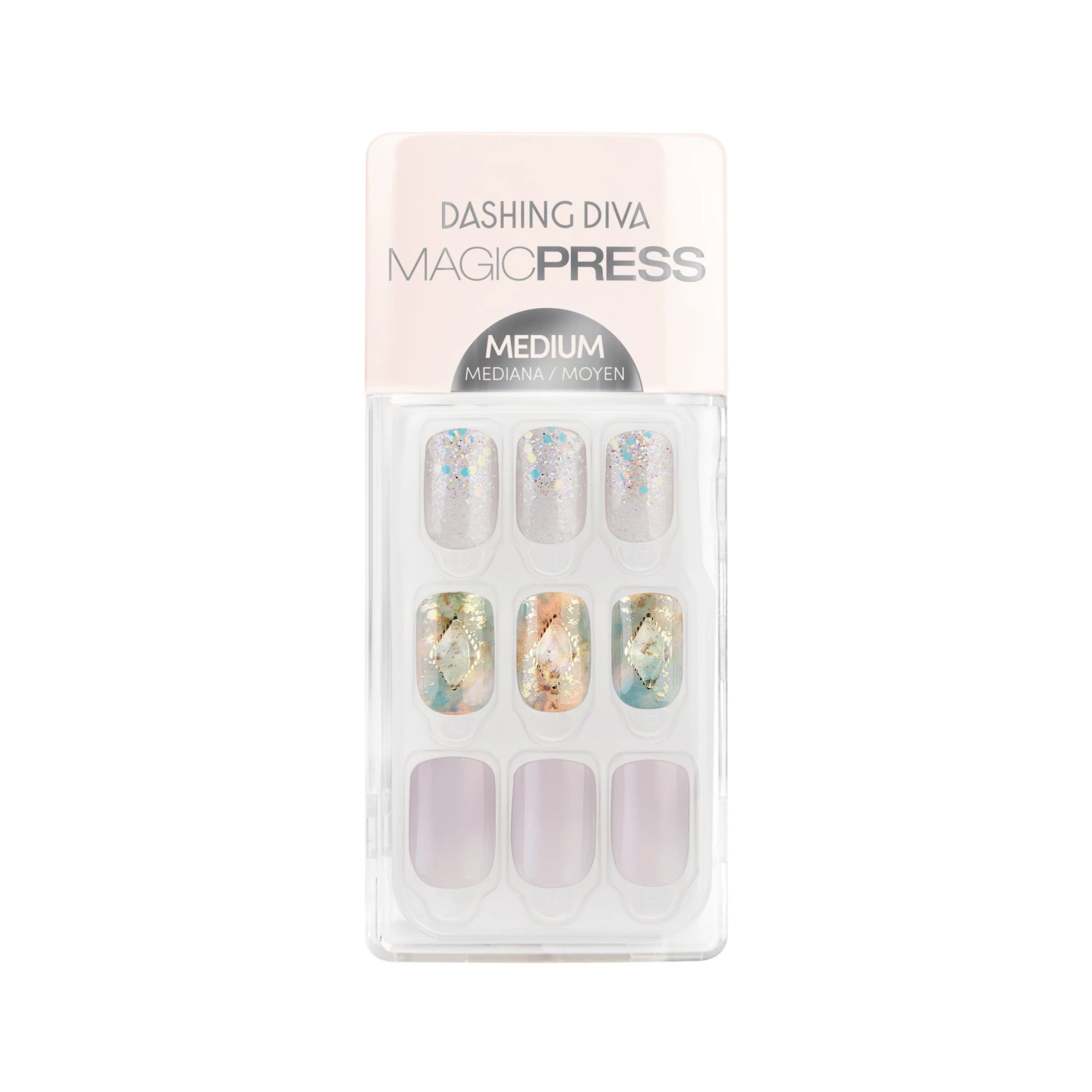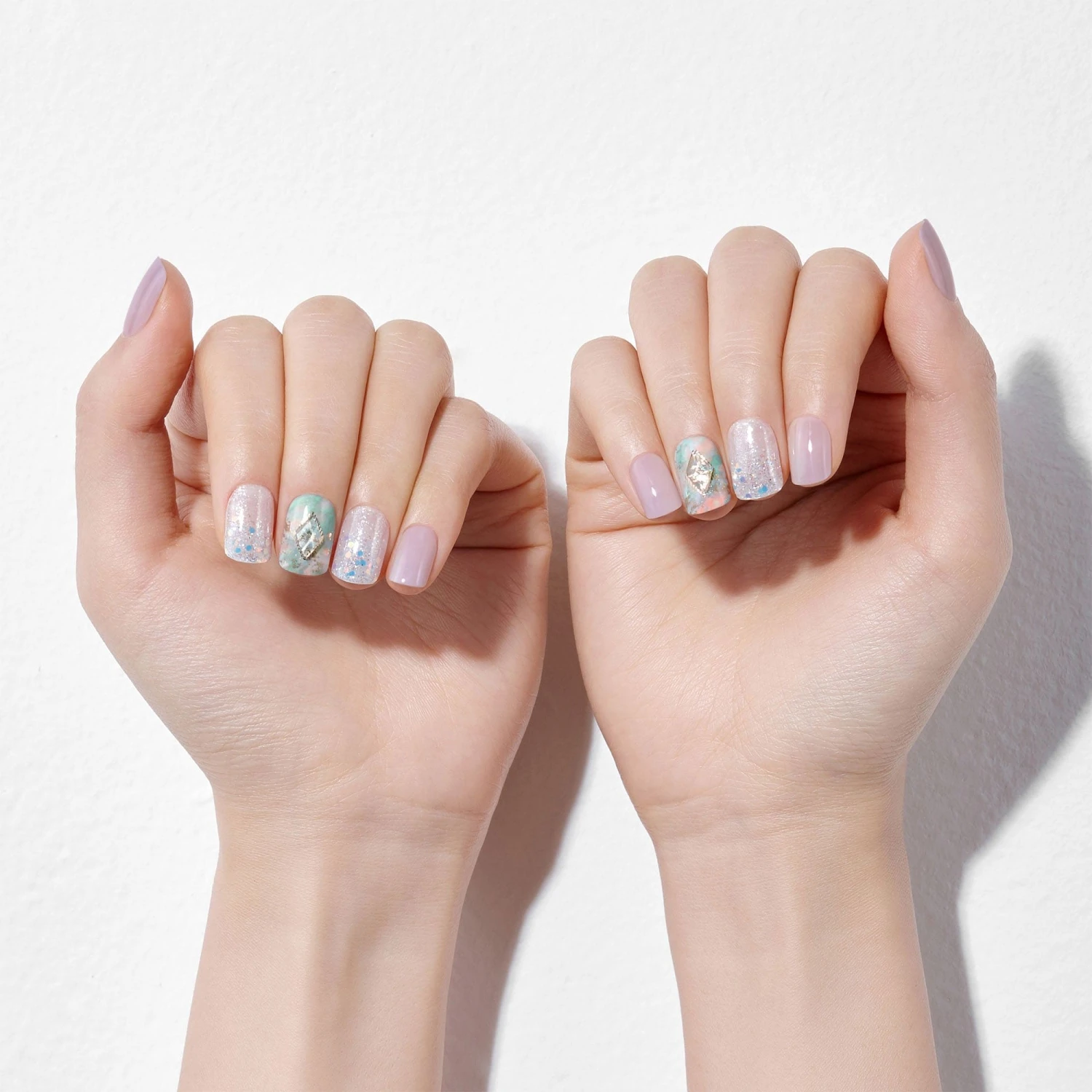 Medium length, square shape, glossy finish press-on gel nails. Glamorous serenity for your mind, body, soul, and nails.