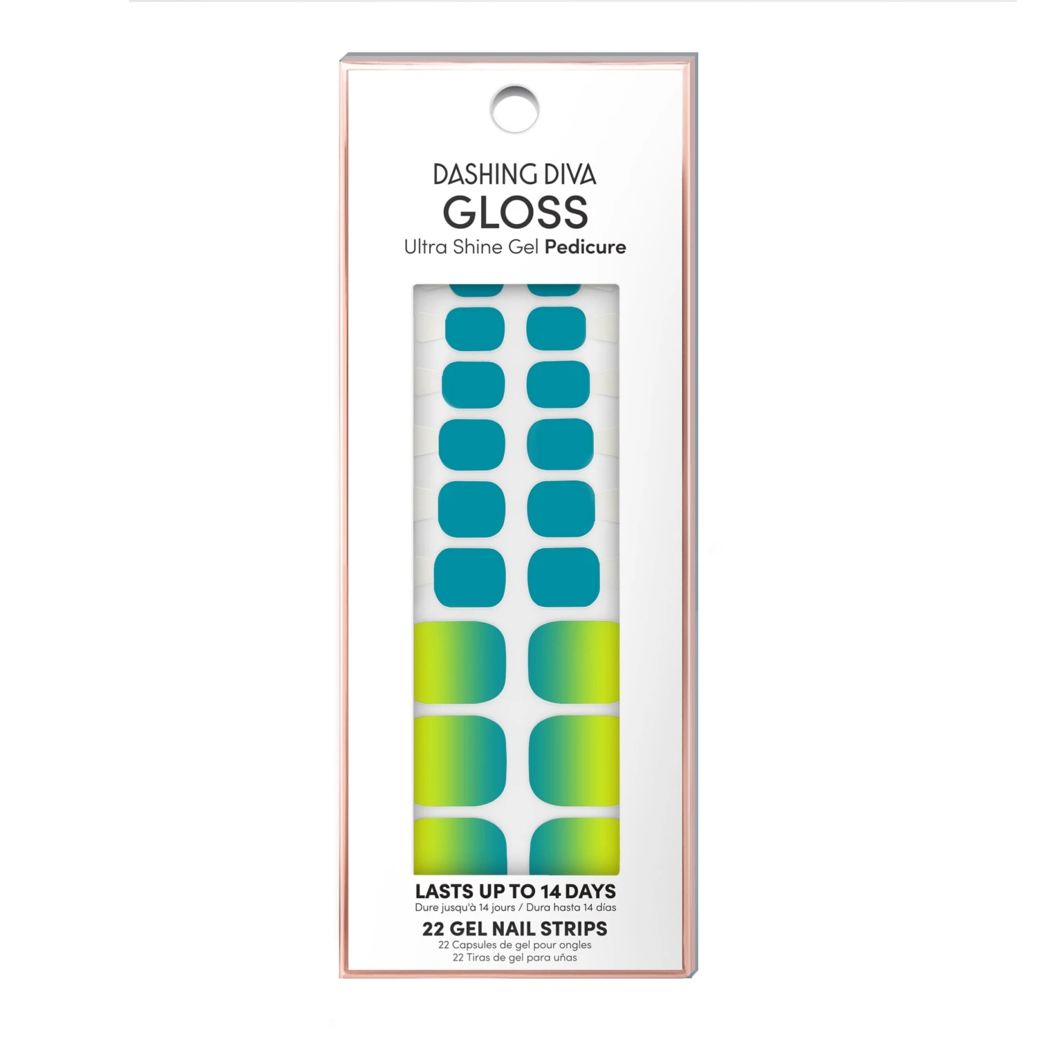 Teal gel pedicure strips featuring neon ombré accents with a glossy, high-shine finish. A misty, unexpected color combo!