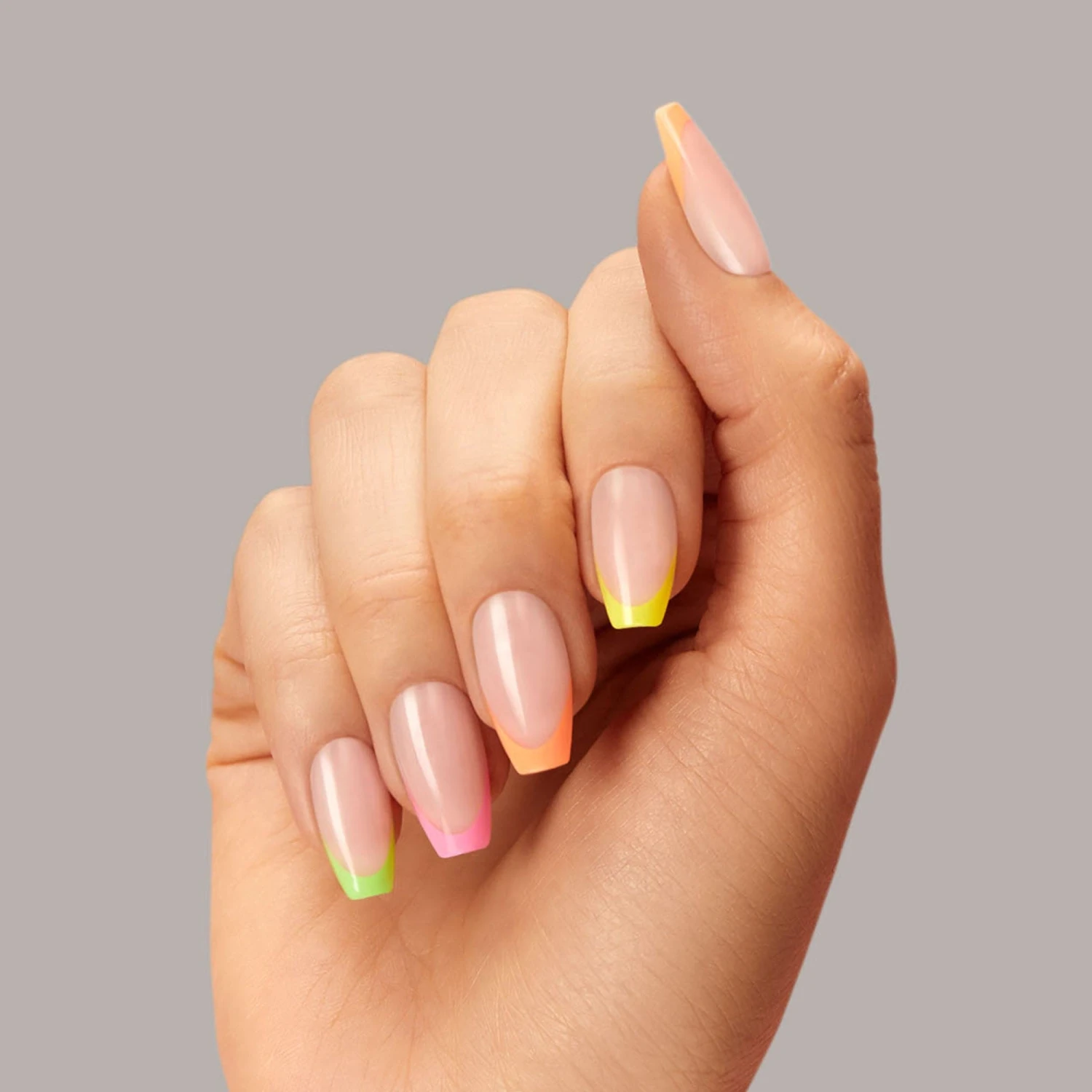 Long length, coffin shape, glossy finish. Sheer nude press-on gel nails featuring multicolor neon french tips.