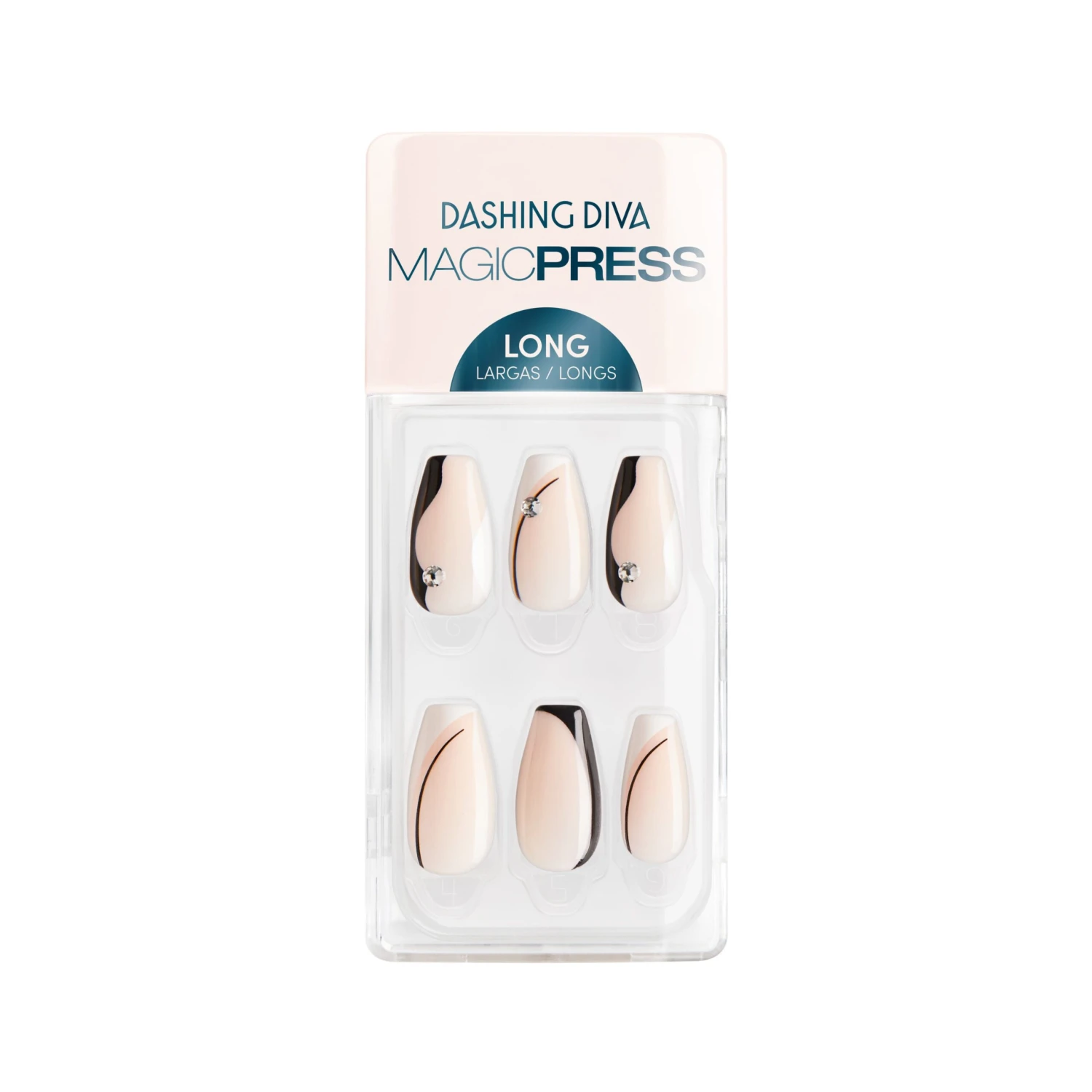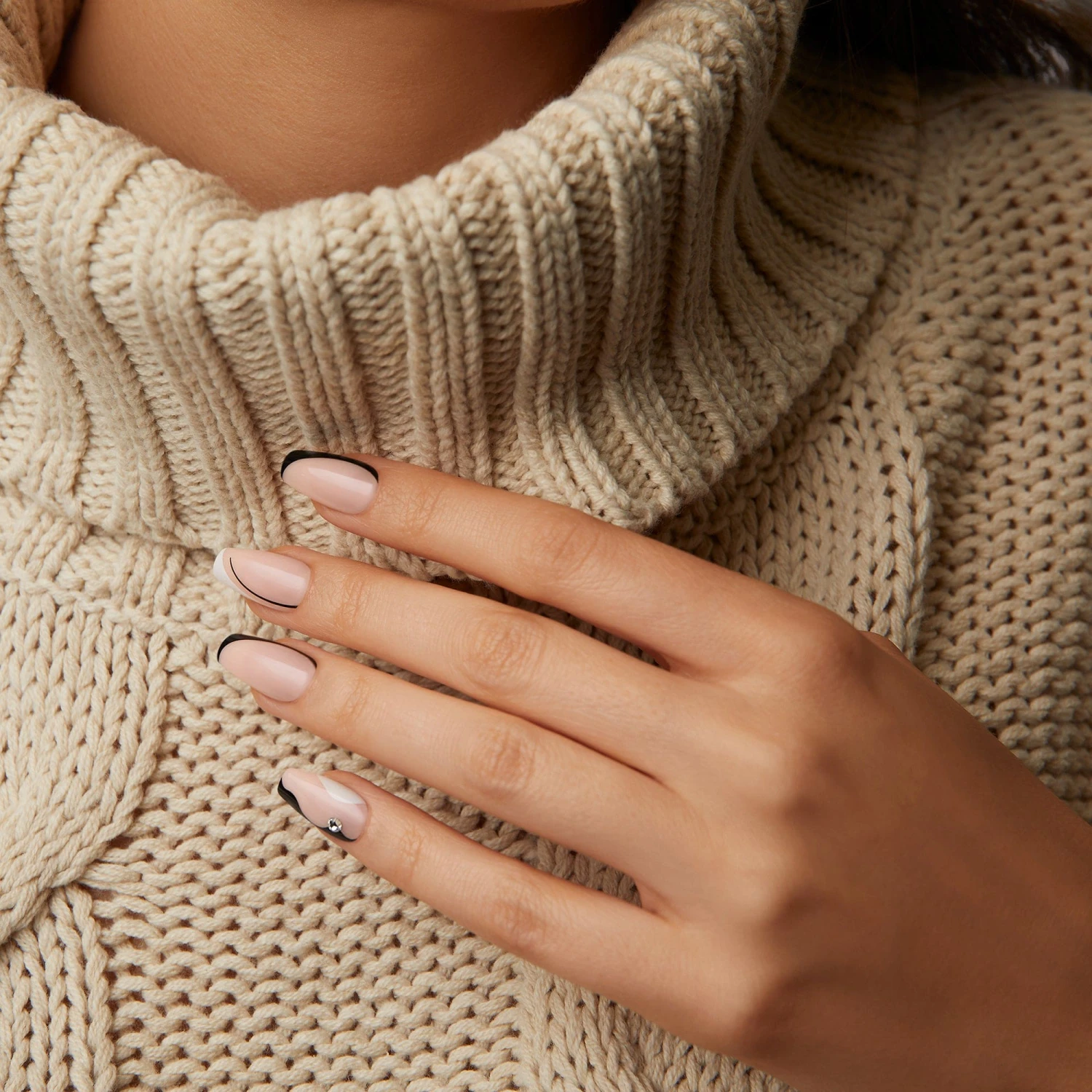 Long length, coffin shape, glossy finish. Semi-sheer nude press-on gel nails featuring rhinestones and black & white abstract colorblocking.
