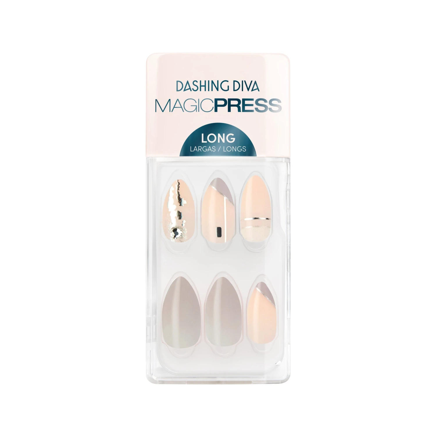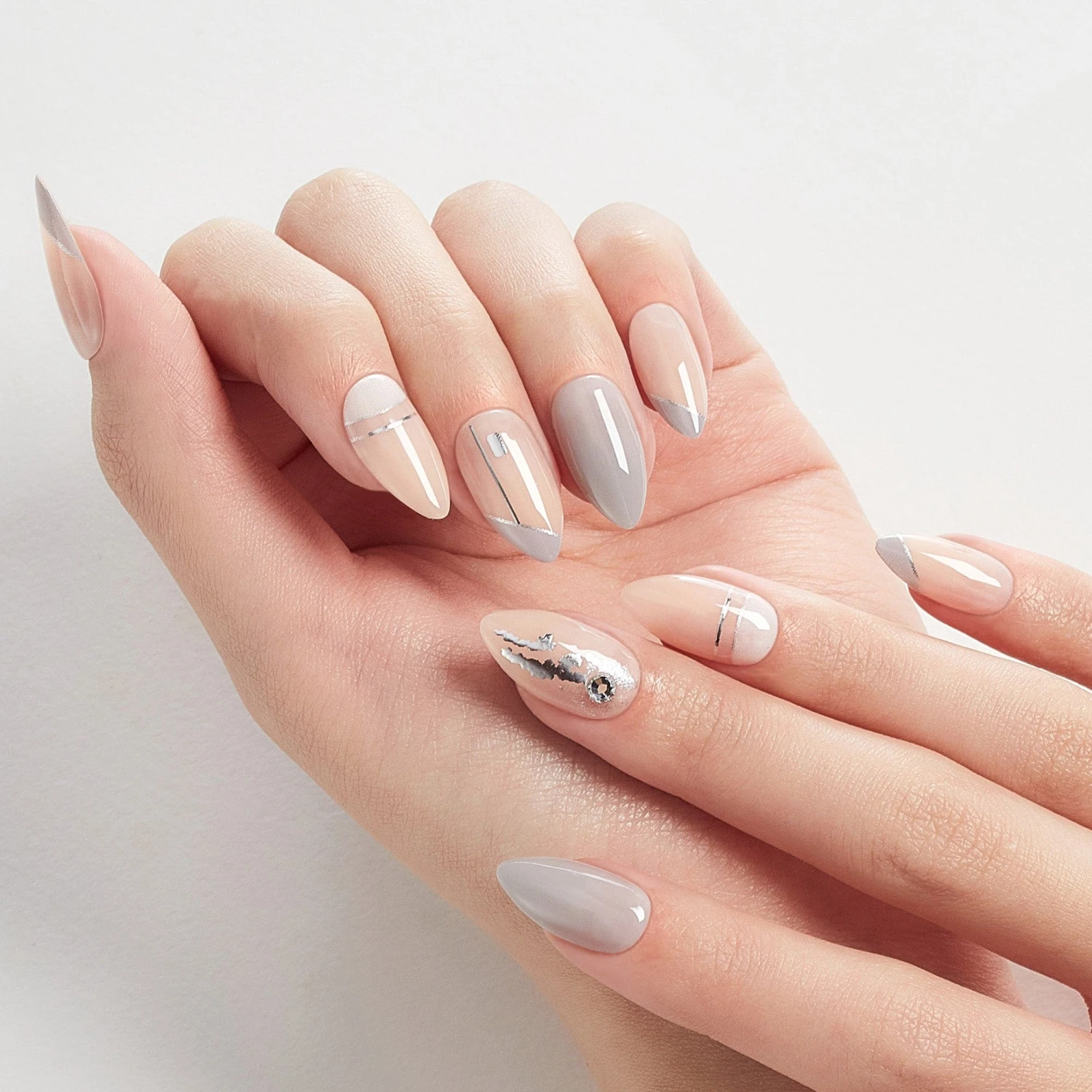 Long length, stiletto shape, glossy finish nude & gray press-on gel nails featuring asymmetrical French tips, iridescent silver foil, rhinestones, and silver glitter.