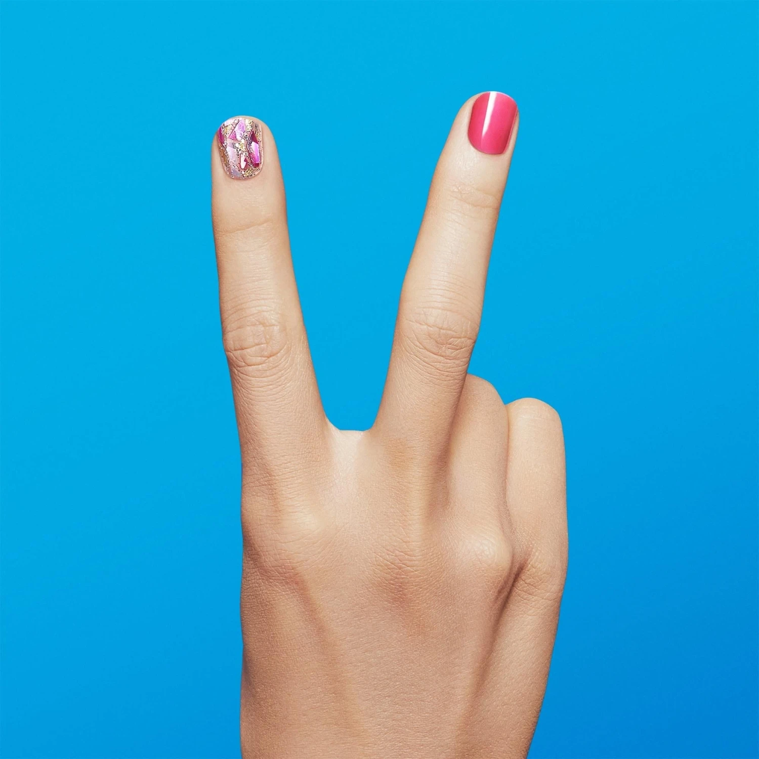 Bubble gum & sheer hot pink gel strips featuring blush glitter and holographic mosaic accents. Extra glam & triple the pink to turn you into the ultimate palm beach babe!