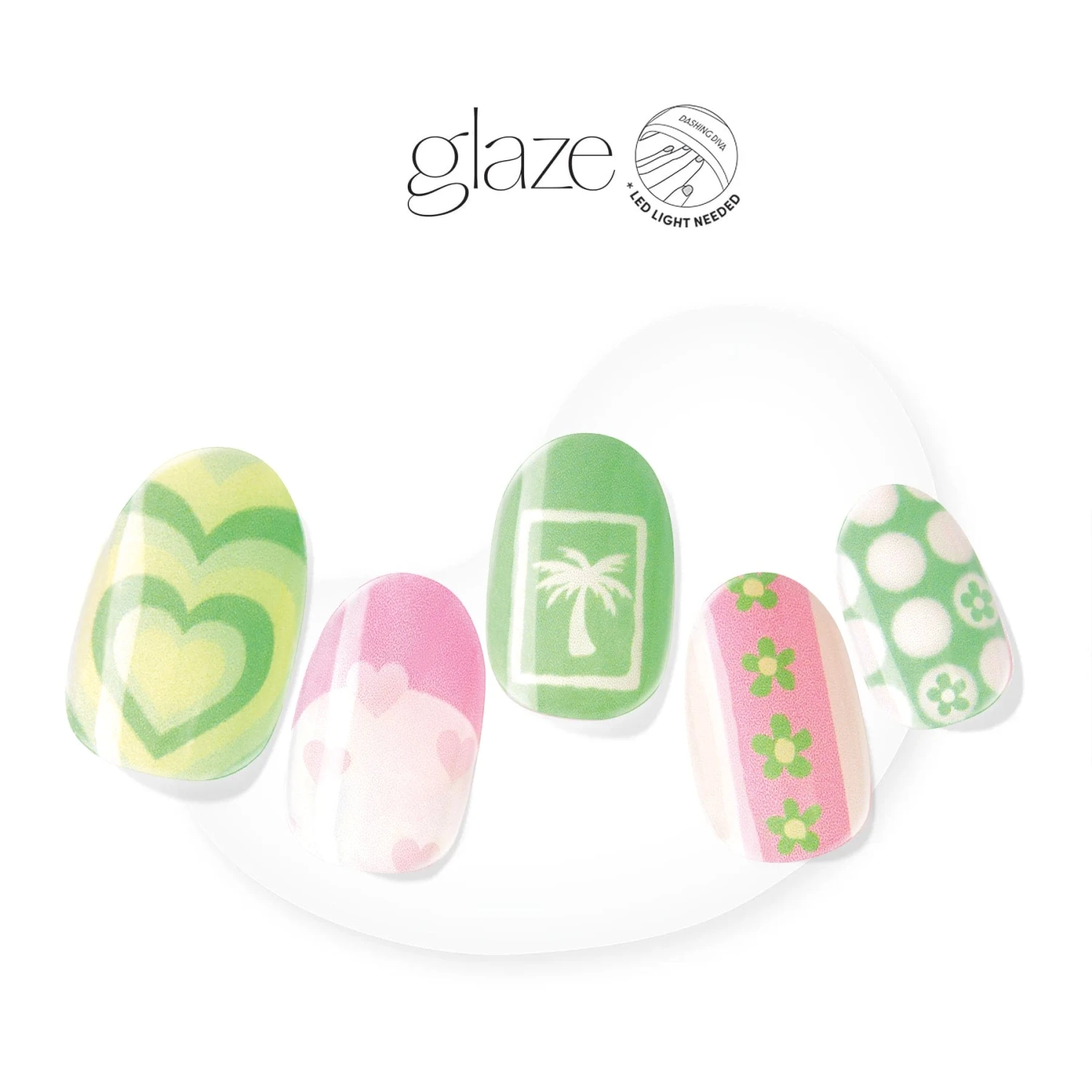 Semi-cured clear, pink, and green gel nail strips featuring retro multi-mani nail art done by Noelle Moore. Nail art includes french tips, palm trees, hearts, and checker print with mega volume & maximum shine..