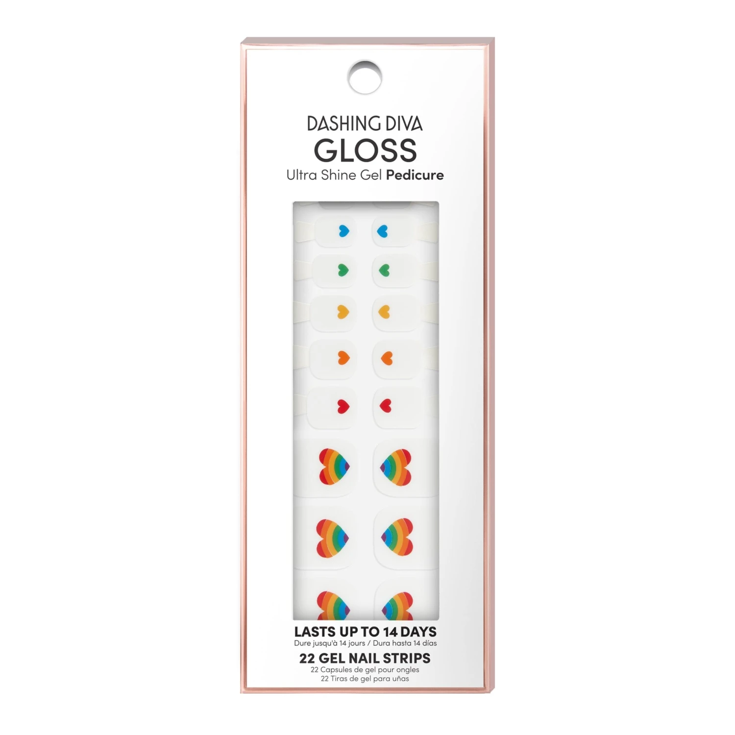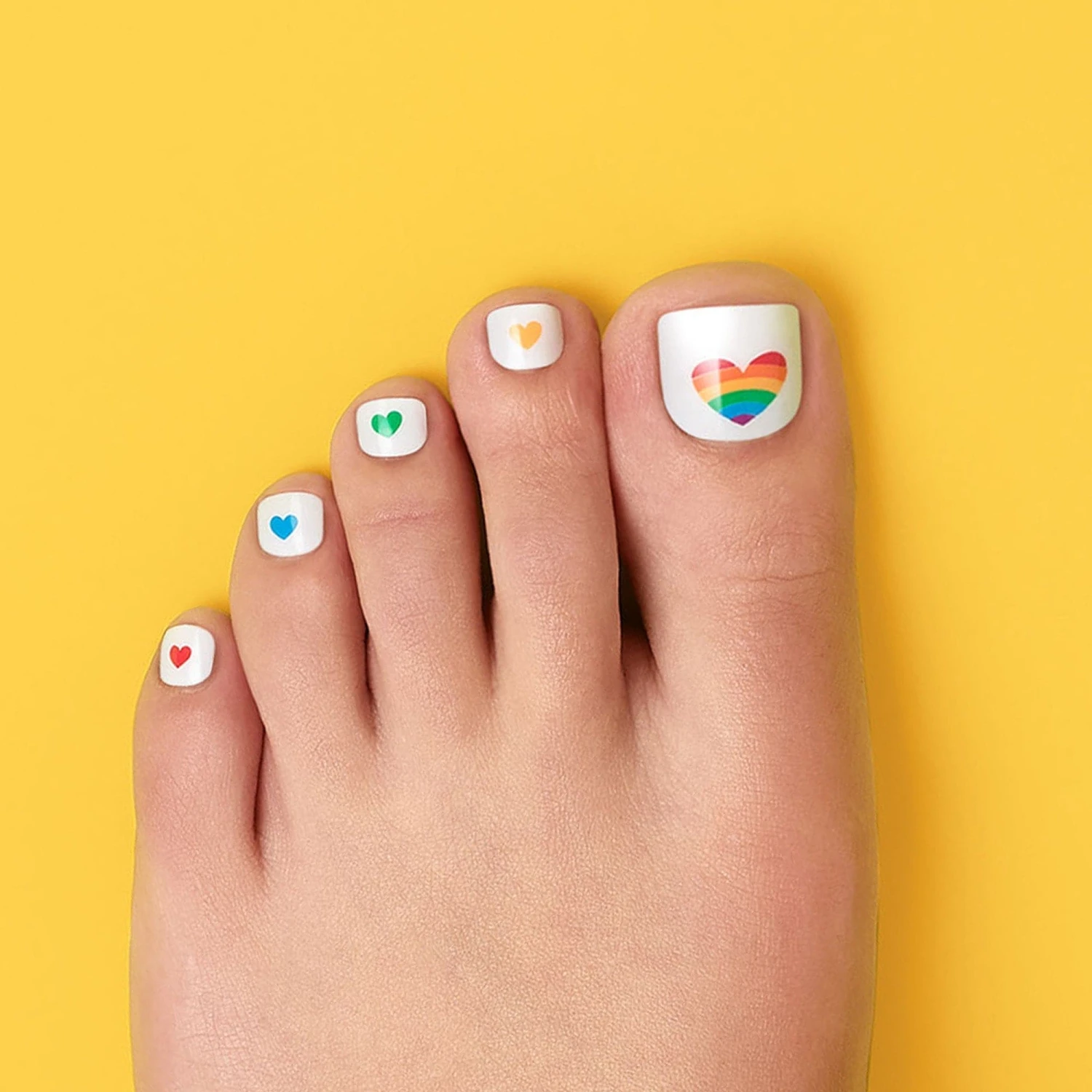 A pedicure signifying peace, love, and representation! White gel pedicure strips featuring rainbow heart accents with a glossy, high-shine finish.
