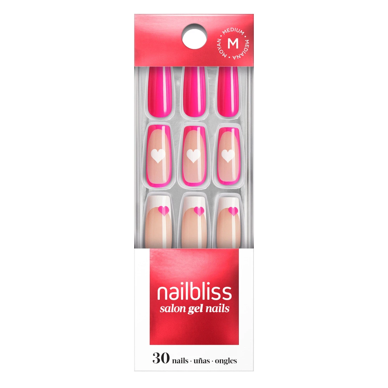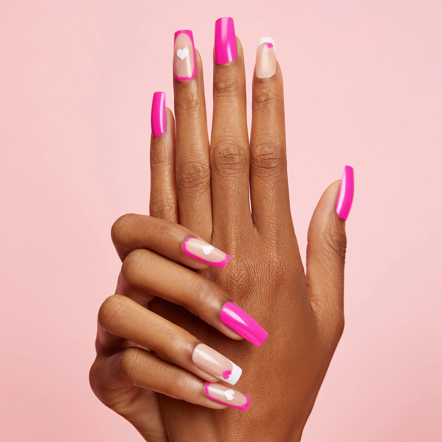 The pout gets you what you want, every time. 💋 Long length, square shape, glossy finish. Sheer nude and hot pink glue-on gel nails featuring pink & white hearts and white french tips.