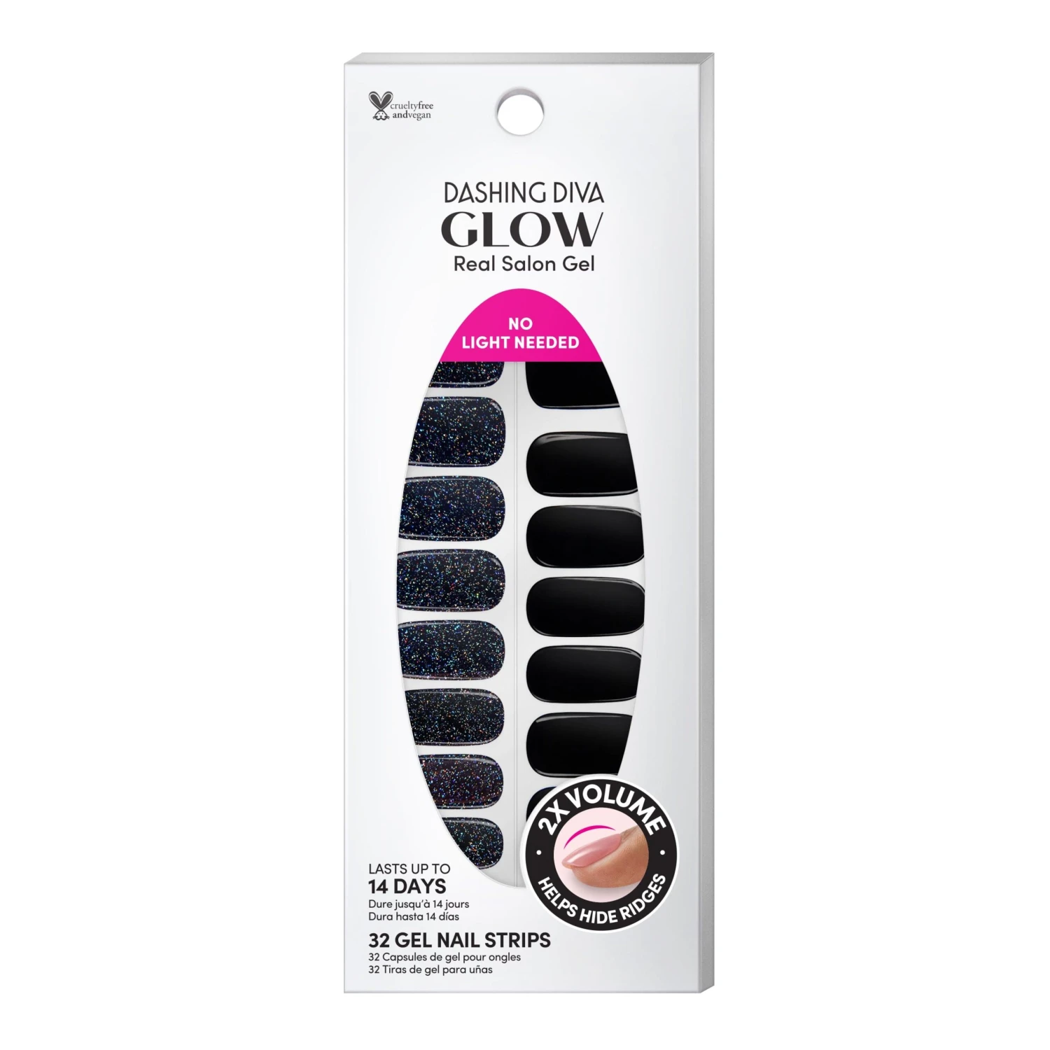 Glittered black gel nail strips with a double gel formula for an ultra-smooth finish.