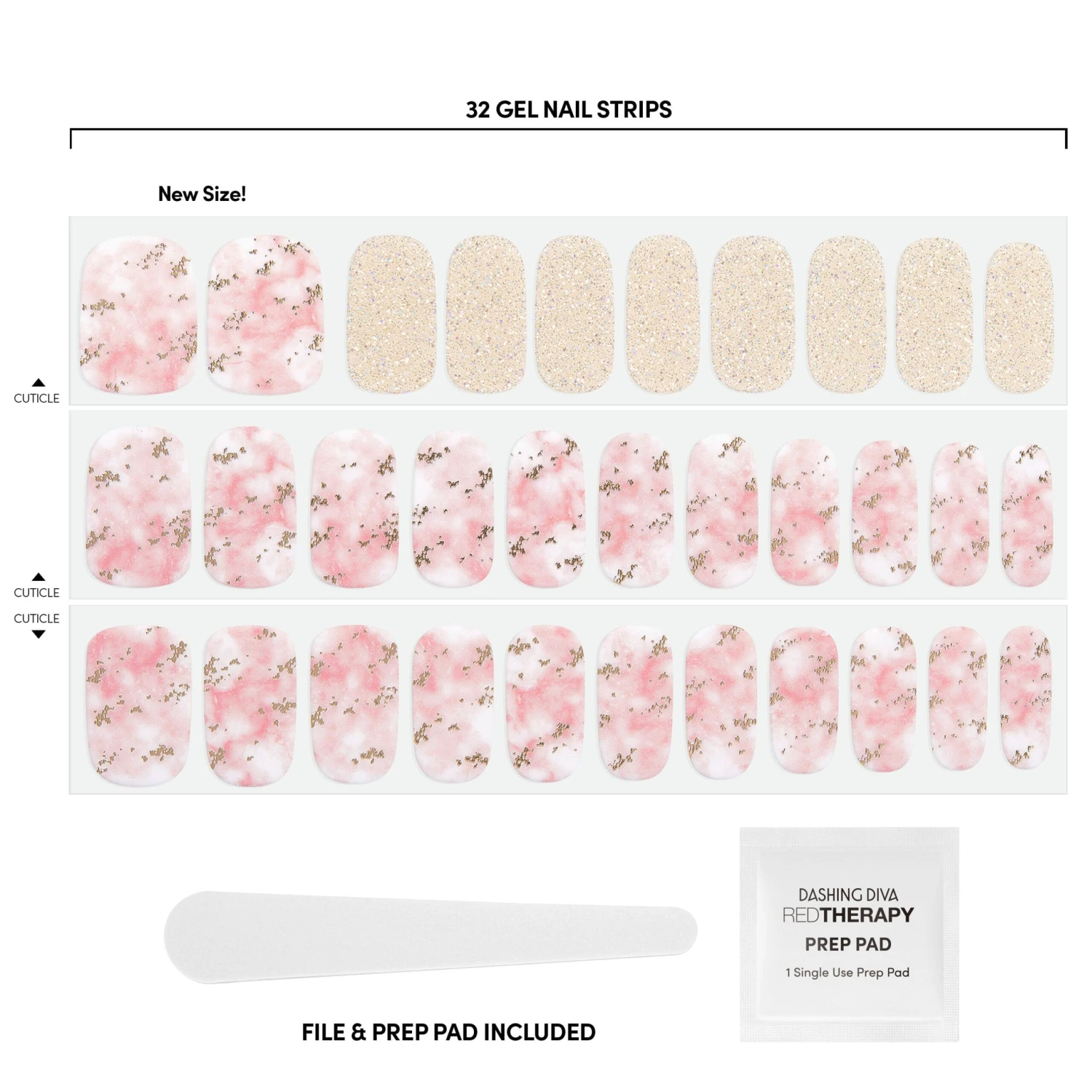 White & blush pink gel nail strips featuring gold glitter with a glossy, high-shine finish