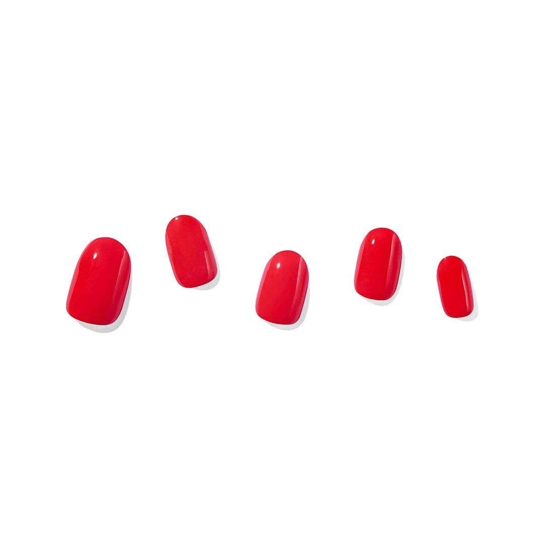 The ultimate ‘look-at-me’ mani. Semi-cured red strips with a glossy, high-shine finish.