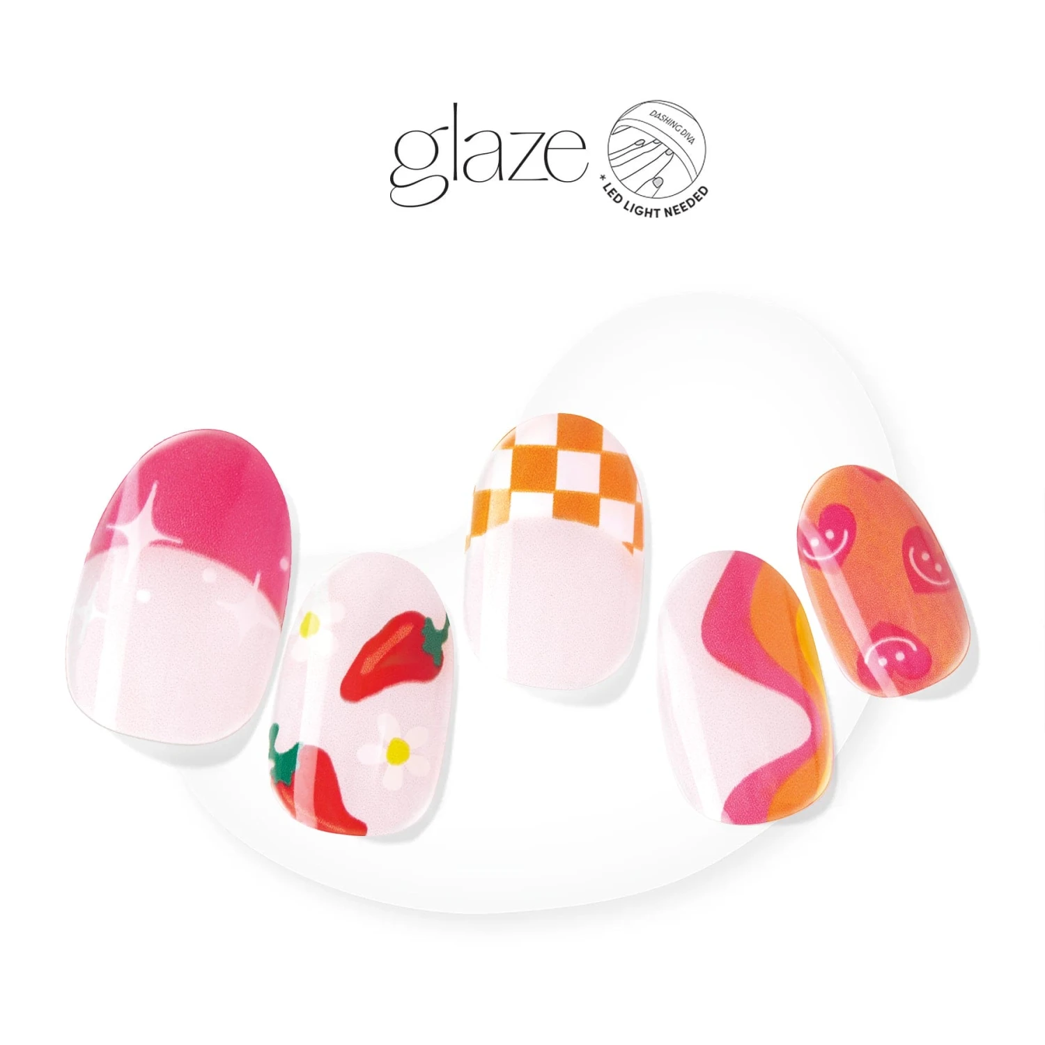 Semi-cured clear gel nail strips featuring retro multi-mani nail art done by Noelle Moore. Nail art includes design french tips, checker print, florals, strawberry icons, and pepper icons with mega volume & maximum shine.