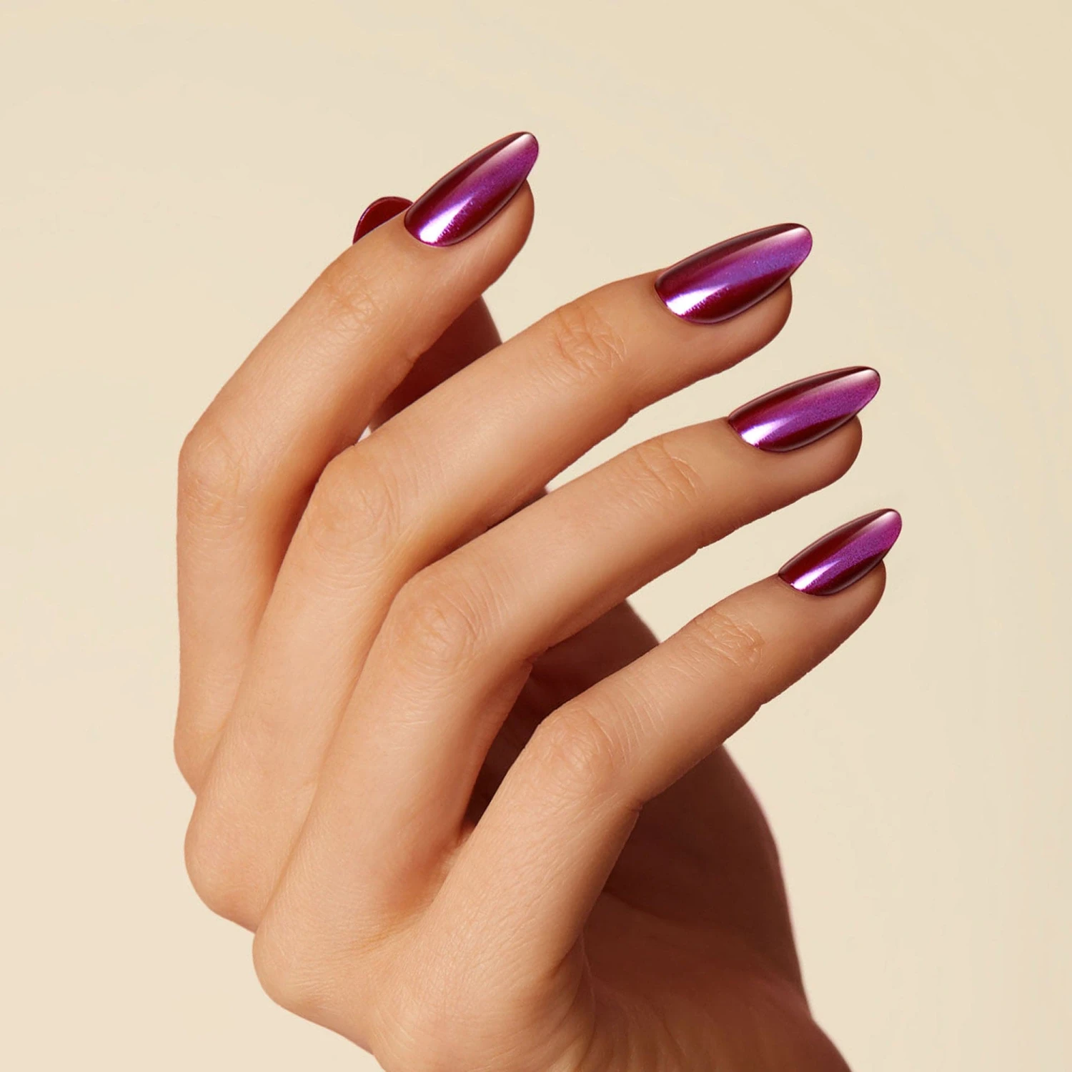 Mulberry press-on gel nails featuring, medium length, almond shape, and metallic chrome finish.